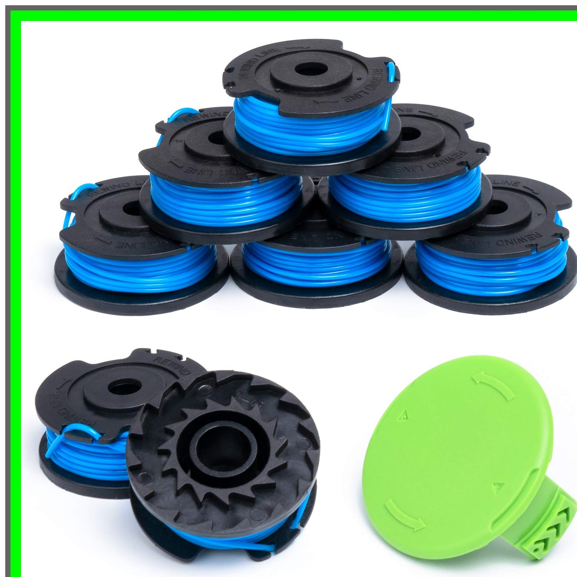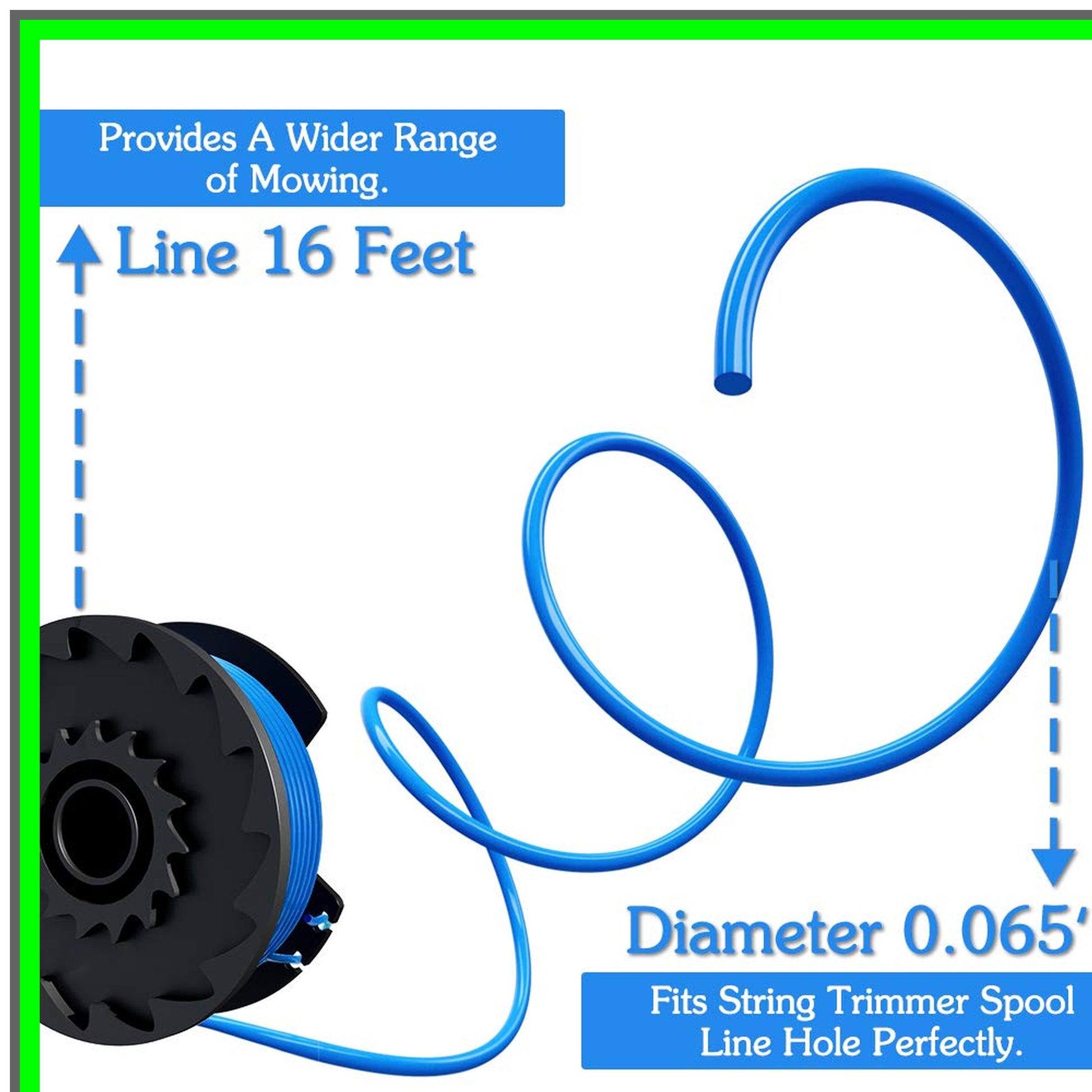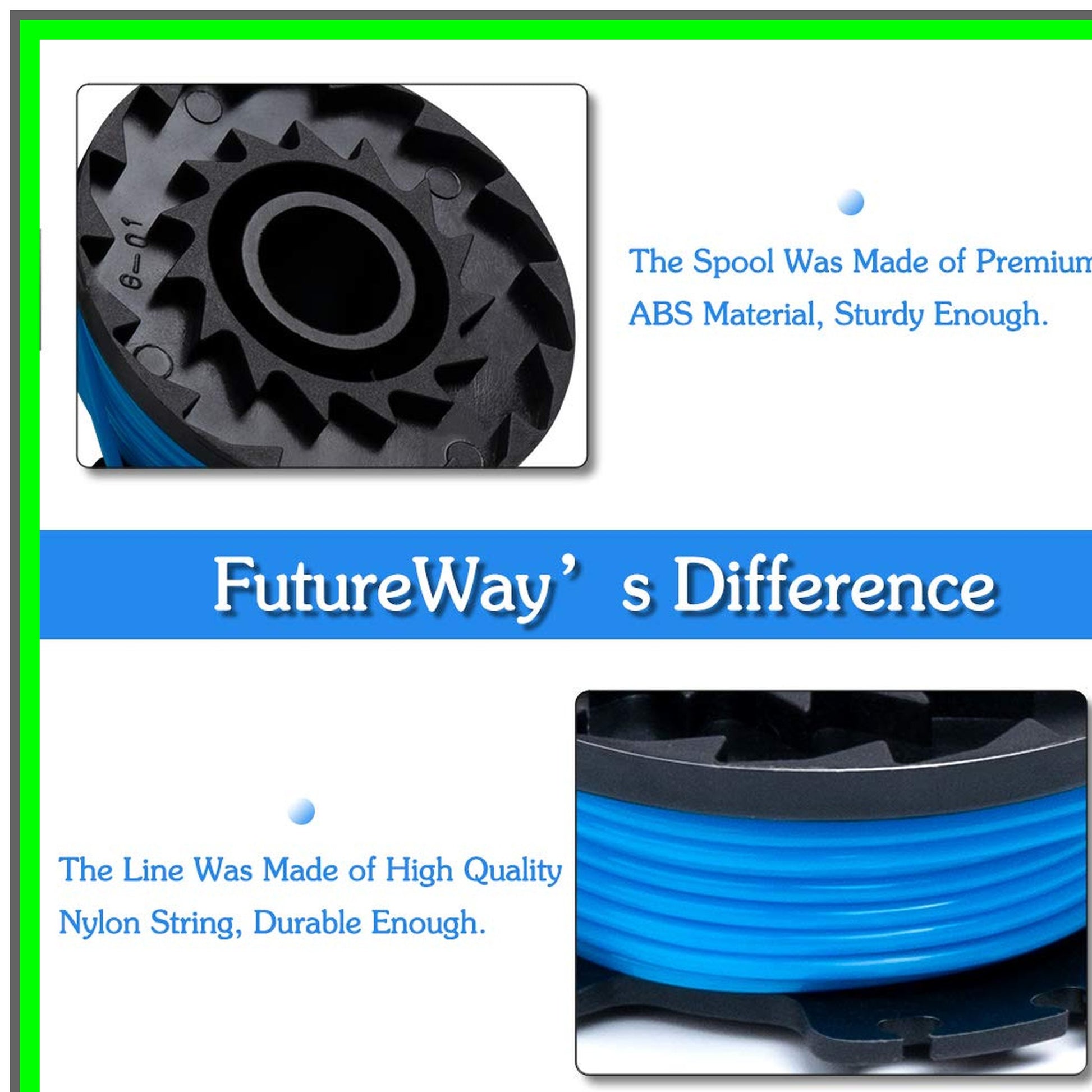 Transform your gardening experience with the FutureWay Trimmer Spool Line, designed specifically for those who demand efficiency and reliability in their yard maintenance. If your garden is overrun with weeds and you're ready to tackle the task, this premium spool line is the perfect solution for your string trimmer. Compatible with a wide range of models, including 21362, 21602, 21062, and many more, this 0.065-inch line is engineered for optimal performance. The package includes eight spools of high-quality nylon line, each measuring 16 feet in length, ensuring you have plenty of material to keep your yard looking pristine. The striking black spool with a vibrant blue line and a green cap not only looks great but is built to last.What sets FutureWay apart is our advanced CNC winding technology, which significantly reduces the risk of damage compared to traditional manual winding. This precision manufacturing process ensures a smooth, even surface that prevents the line from getting stuck or popping out during use. Unlike rigid plastic lines that can snap easily, our flexible nylon line offers durability and resilience, making it ideal for tackling tough weeds without compromising performance.Additionally, our package includes a replacement string cap cover, saving you both time and moneyβno need to purchase it separately! With a robust ABS spool and cap, you can trust that this product is built to withstand the rigors of outdoor use.Please remember to take necessary precautions while using the trimmer, as the strong centrifugal force can lead to fast line cutting. For particularly tough weeds, we recommend using blades for the best results. Ensure you receive the authentic FutureWay product to enjoy our complimentary replacement service. Elevate your gardening game today with the FutureWay Trimmer Spool Line!
