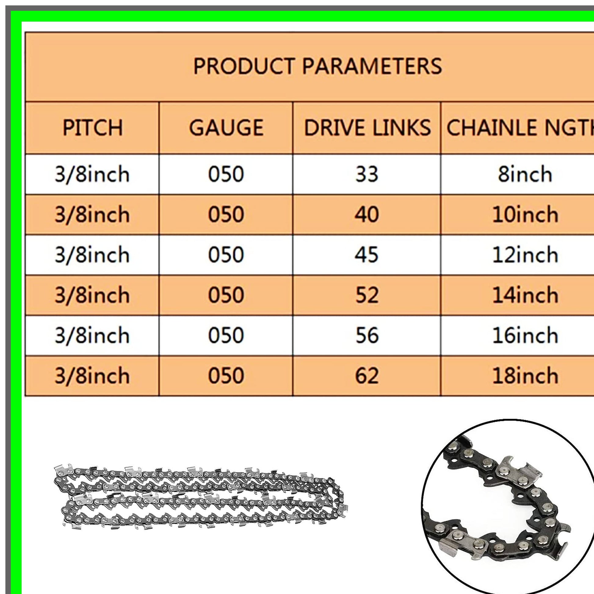 Revitalize your cutting experience with our premium 8-inch chainsaw replacement chain, designed for efficiency and durability. This high-quality chainsaw chain features a 0.050" gauge and a 3/8" low-profile pitch, making it the perfect choice for both professional landscapers and DIY enthusiasts. With 33 drive links, this chain ensures smooth operation and precise cuts, allowing you to tackle any tree trimming or pruning task with ease.Compatible with a wide range of pole saws, this replacement chain is engineered to fit models from top brands, including Remington, Kobalt, Sun Joe, and Wen. Whether you're using the Remington RM4050 or the Kobalt 40V pole saw, our chain guarantees a seamless fit and optimal performance. Crafted from high-quality materials, this chainsaw chain is built to withstand the rigors of heavy use, providing you with long-lasting reliability. Its sharp teeth are designed for efficient cutting, reducing the time and effort needed to complete your outdoor projects. Upgrade your pole saw with our 8-inch chainsaw replacement chain and experience the difference in performance. Ideal for homeowners and professionals alike, this chain is perfect for maintaining your garden, clearing branches, or preparing firewood. Donβt settle for subpar chains that wear out quickly. Choose our premium replacement chain for a dependable, high-performance solution that keeps your pole saw running smoothly. Order now and take the first step towards effortless cutting and enhanced productivity in your outdoor tasks!