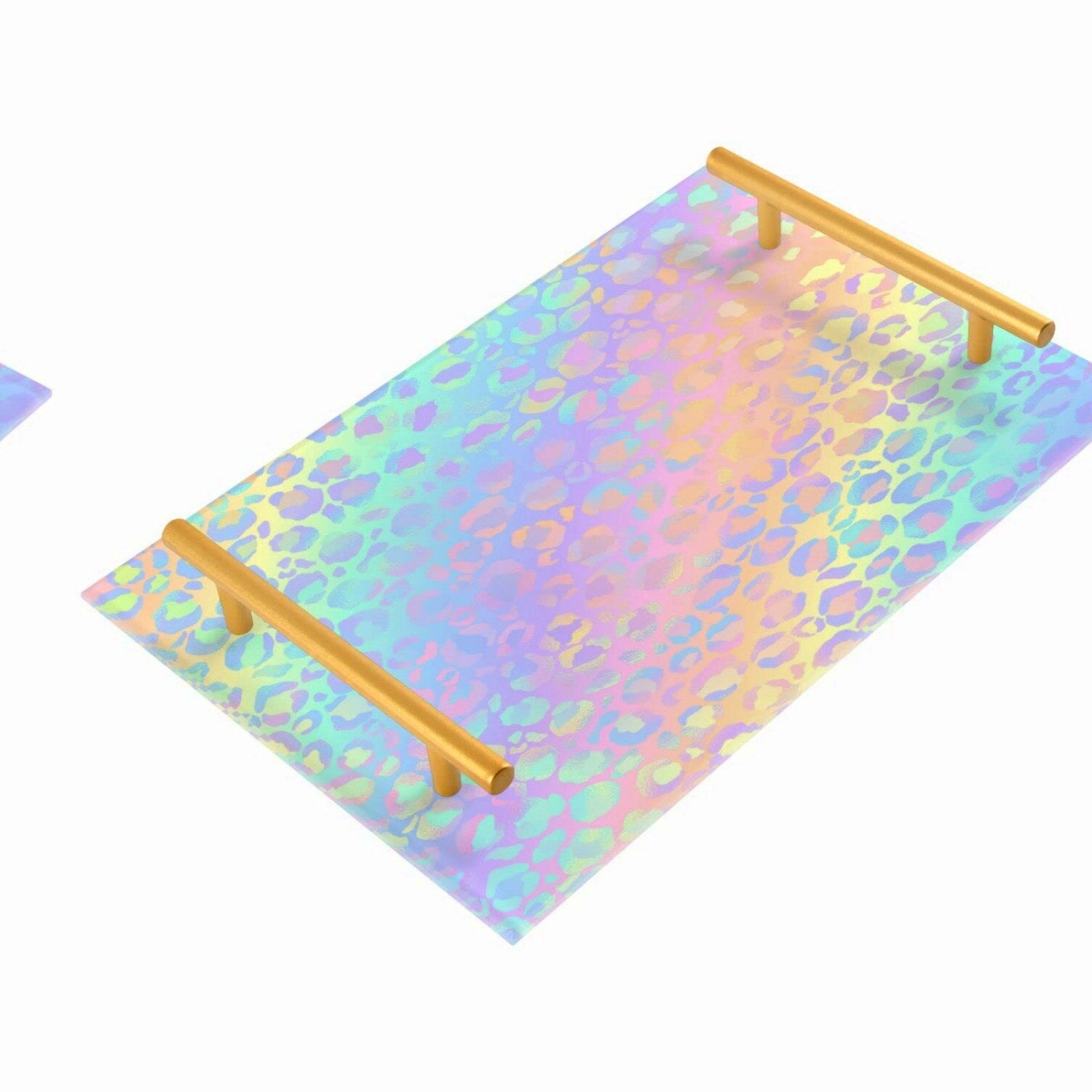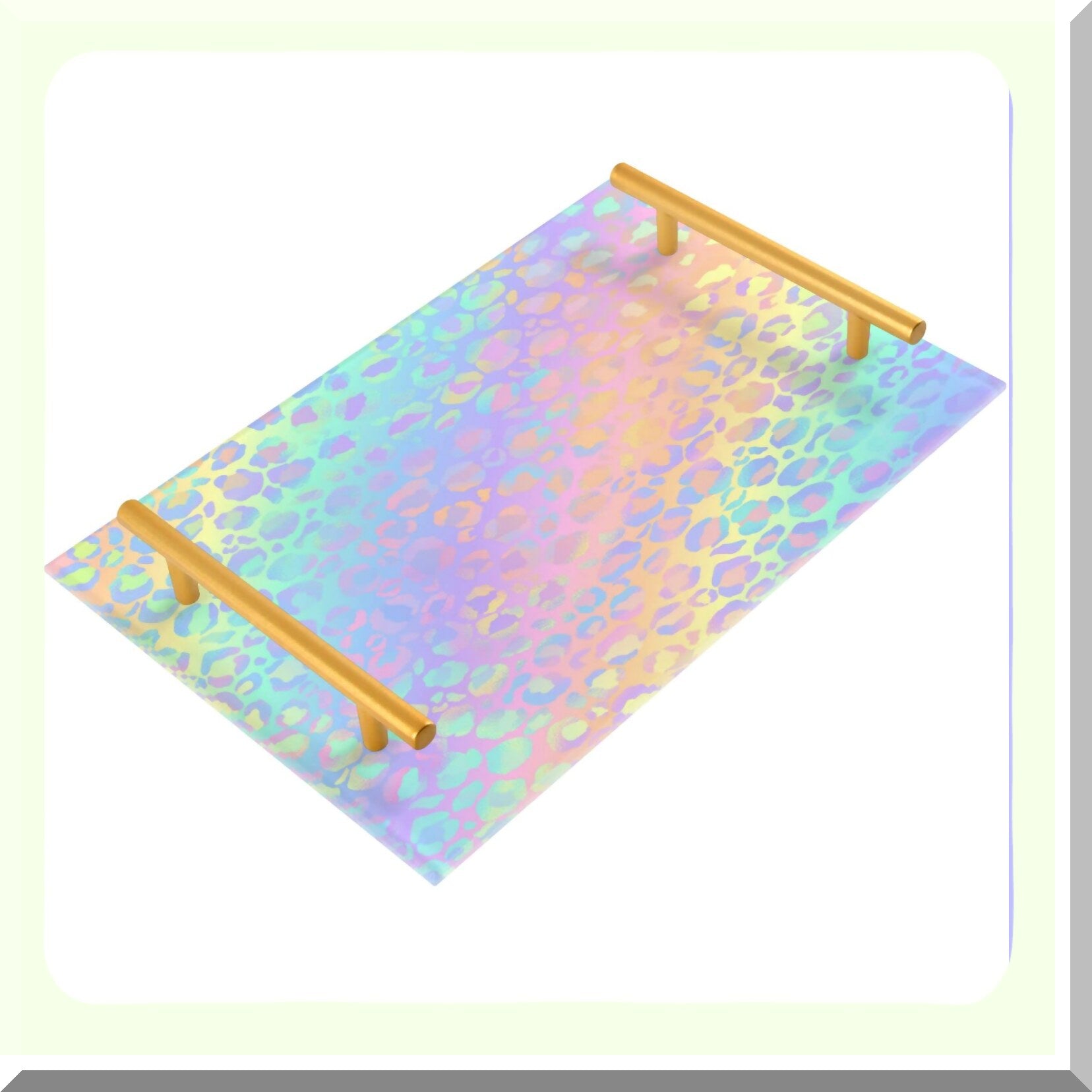 This multifunctional serving tray measures approximately 20 x 30 cm and is crafted from durable acrylic material. It features a unique aluminum alloy handle design with single-sided printing, offering a modern decorative touch. Ideal for various uses, it can serve as a bathroom jewelry or perfume organizer, a dresser tray for makeup and accessories, or a kitchen holder for cruet sets and small items. Its versatile design allows it to function as a serving platter, art board, or gift item. The tray helps keep your items neatly displayed and easily accessible, whether on a bathroom counter, bedroom dresser, or kitchen countertop. Its stylish pastel leopard marble pattern adds a contemporary aesthetic to any space. Perfect for organizing and displaying your essentials, this tray combines functionality with modern design, making it a practical and attractive addition to your home.