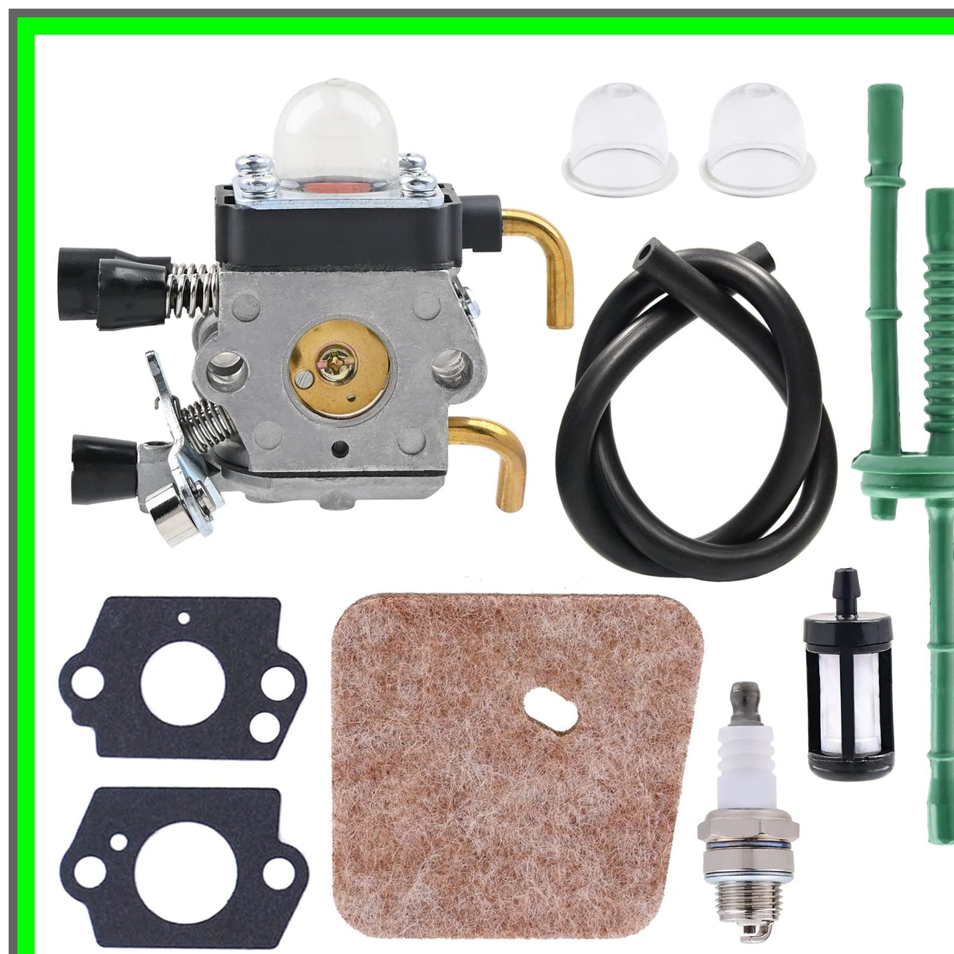 Revitalize your outdoor power equipment with our premium carburetor kit, meticulously designed for compatibility with a range of STHIL models, including the FS series string trimmers, HS series hedge trimmers, KM series kombi motors, HT series pole pruners, FC series edgers, and SP series special harvesters. This comprehensive package includes everything you need to ensure optimal performance and longevity of your tools.Inside this all-in-one kit, you’ll find a high-quality carburetor engineered for precision fuel delivery, ensuring your equipment runs smoothly and efficiently. The package also includes two durable gaskets to create a secure seal, preventing leaks and maintaining peak performance. To enhance your starting experience, we’ve included two reliable primer bulbs that facilitate easy fuel priming, making your equipment ready to go in no time.Additionally, the kit comes with a premium spark plug designed for reliable ignition, a fuel filter to keep your fuel system clean, a fuel line for efficient fuel flow, and an air filter to ensure your engine breathes clean air. Each component is crafted with durability in mind, ensuring that your tools remain in top condition for all your landscaping needs.Whether you’re a professional landscaper or a weekend warrior, this carburetor kit is essential for maintaining the efficiency and reliability of your STHIL equipment. Don’t let subpar performance hold you back—upgrade your tools today and experience the difference in power and efficiency. Perfect for routine maintenance or as a proactive replacement, this kit is your go-to solution for keeping your outdoor power tools in peak condition.