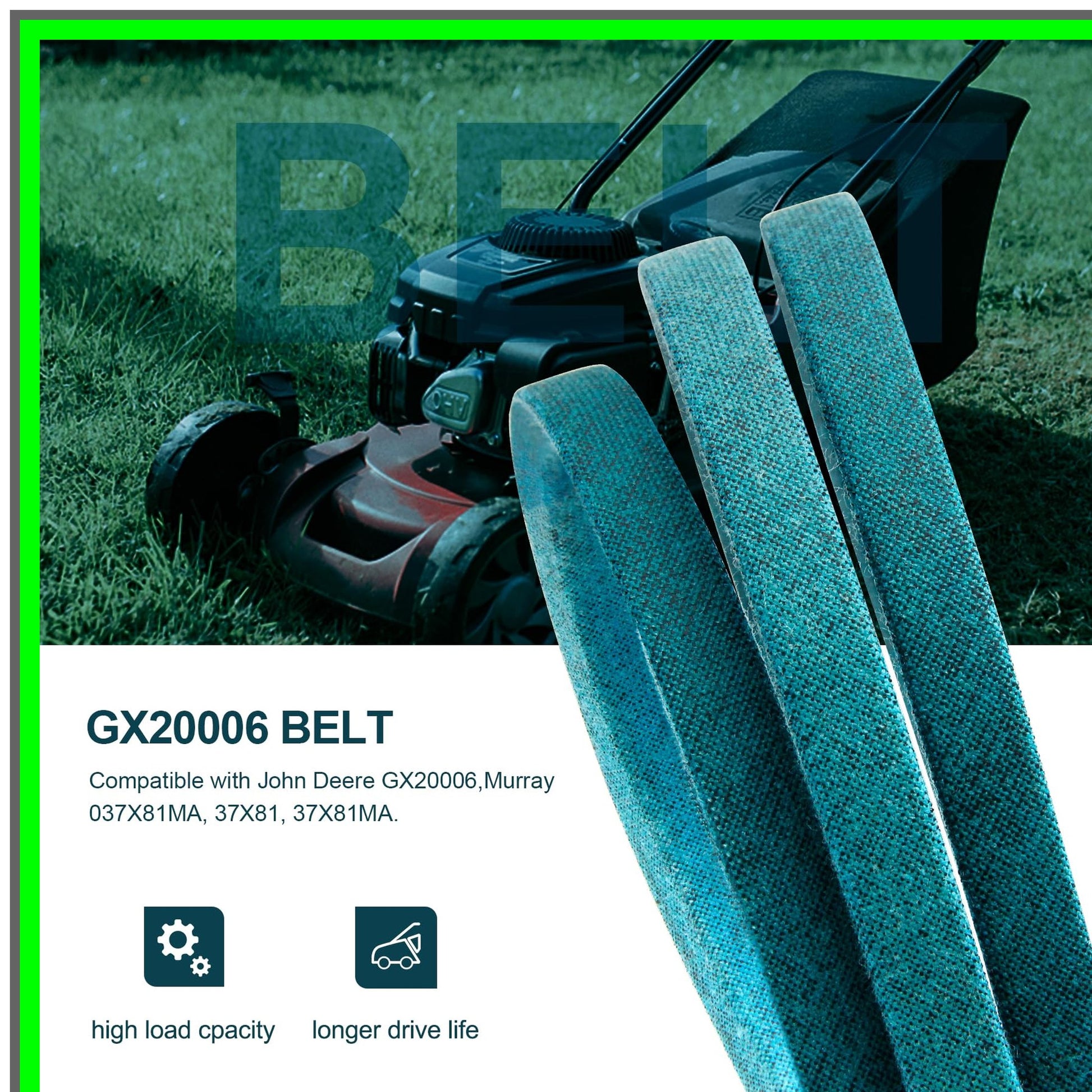 Revitalize your lawn care routine with our premium lawn mower deck belt, expertly designed to deliver exceptional performance and durability. Measuring 1/2" in width and 89" in length, this high-quality replacement belt is compatible with a wide range of popular lawn mower models, ensuring a perfect fit for your equipment.Engineered to replace OEM part numbers such as John Deere GX20006 and Murray 037X81MA, this belt is a reliable choice for maintaining the efficiency of your mower. It seamlessly fits various John Deere models, including the D series (D110, D120, D125, D130, D140, D150, D155, D160, D170) and the L series (L105, L107, L108, L110, L111, L118, L120, L130, LA110, LA115, LA120, LA125, LA130, LA135, LA140, LA145, LA150, LA155, LA165, LA175, S240, X110, X120, X125, X140, X145, X165). Additionally, it accommodates Murray 42" and 46" decks equipped with Dana transmissions, as well as Scotts models like L17.542, L2048, and Sabre 1642HS.To ensure you select the correct belt for your mower, always refer to your OEM part number, typically found in your user manual or on the OEM sticker located under the hood or seat of your machine. If the part number is unavailable, simply measure the outer circumference and width of your existing belt to confirm compatibility.Upgrade your lawn mower with this robust deck belt and experience smoother operation, enhanced cutting performance, and extended longevity. Perfect for both residential and commercial use, this essential accessory will keep your lawn looking pristine all season long. Don’t let a worn-out belt slow you down—invest in quality and reliability today!