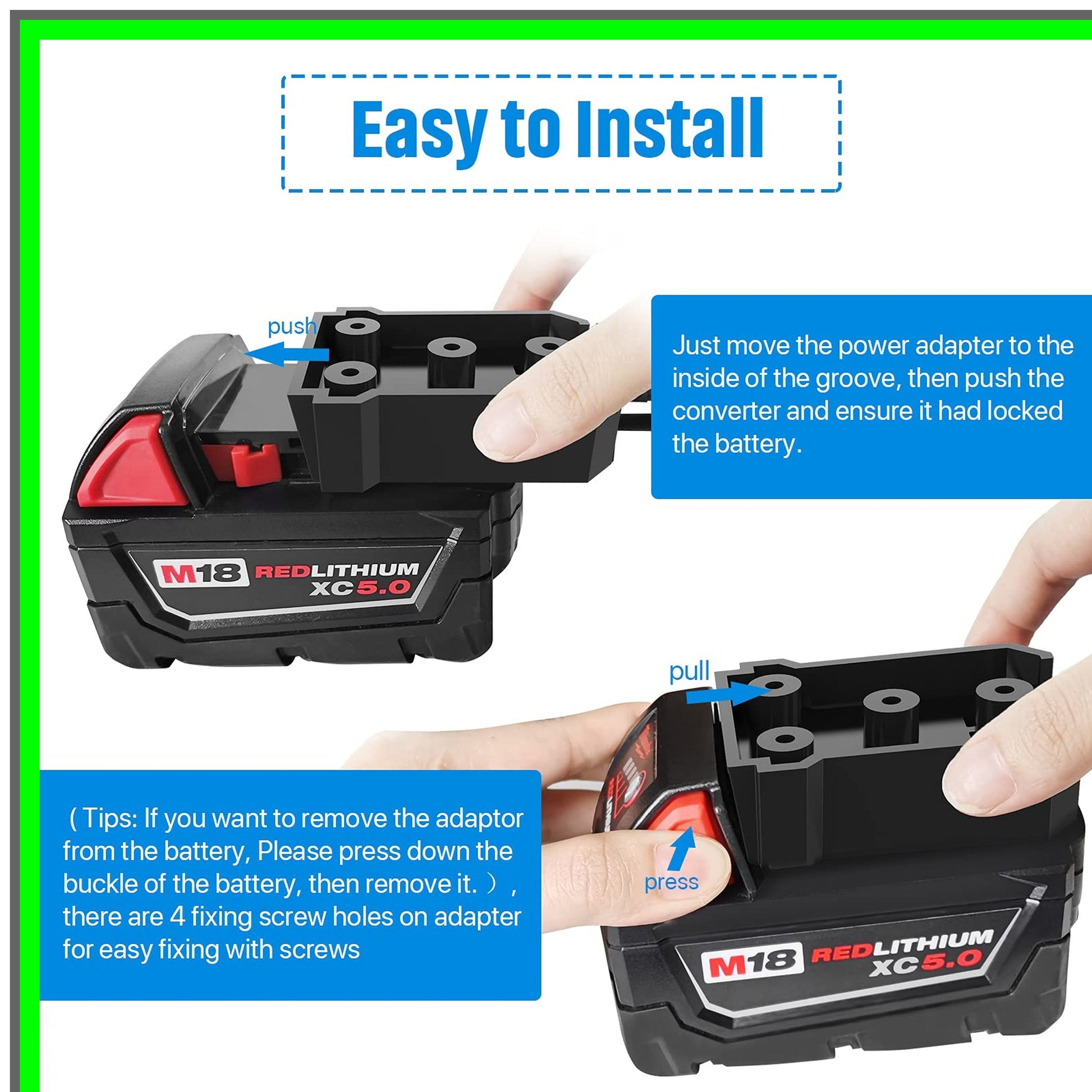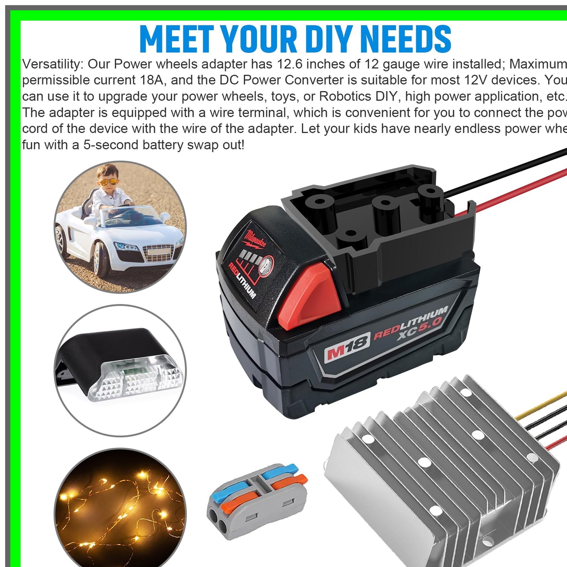Unlock the full potential of your Milwaukee 18V battery with our advanced DC Power Converter and Power Wheel Adapter. Designed for versatility and efficiency, this step-down converter transforms DC 18V to a reliable DC 12V output, delivering a robust 180W of power. Perfect for powering toys, work lights, and other devices, this converter is an essential tool for DIY enthusiasts and professionals alike.Crafted from high-quality ABS plastic, this durable converter features a compact design measuring 3.7 x 2.3 x 0.95 inches, making it easy to integrate into your projects. The included 12 AWG wire ensures optimal conductivity and heat resistance, while the 4 included 30A fuses provide essential overcurrent protection, ensuring your devices operate safely and efficiently.Installation is a breeze with our user-friendly design. Simply slide the power adapter into the designated groove, push the converter to lock it securely onto the battery, and youโre ready to go. For added convenience, the adapter includes four fixing screw holes for stable mounting. Safety is our top priority. The integrated switch allows for easy on/off operation, while the copper contacts enhance conductivity and minimize heat buildup. Please note that this product is not a charger; it directly outputs battery voltage and power. Ensure proper connections by attaching the red wire to the positive terminal and the black wire to the negative terminal, avoiding contact between the two.Whether youโre powering up your favorite toys or illuminating your workspace, this DC Power Converter and Power Wheel Adapter is your go-to solution for reliable, high-performance energy conversion. Elevate your projects today with this indispensable accessory!
