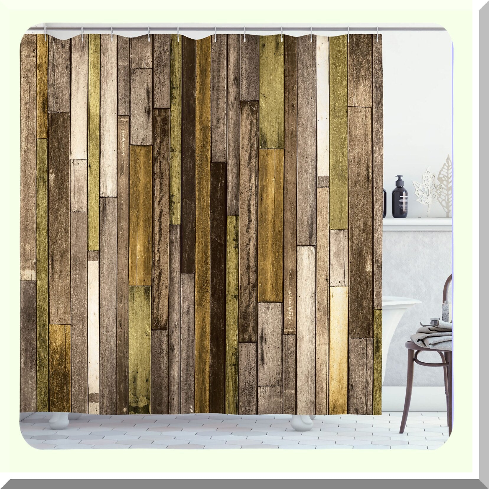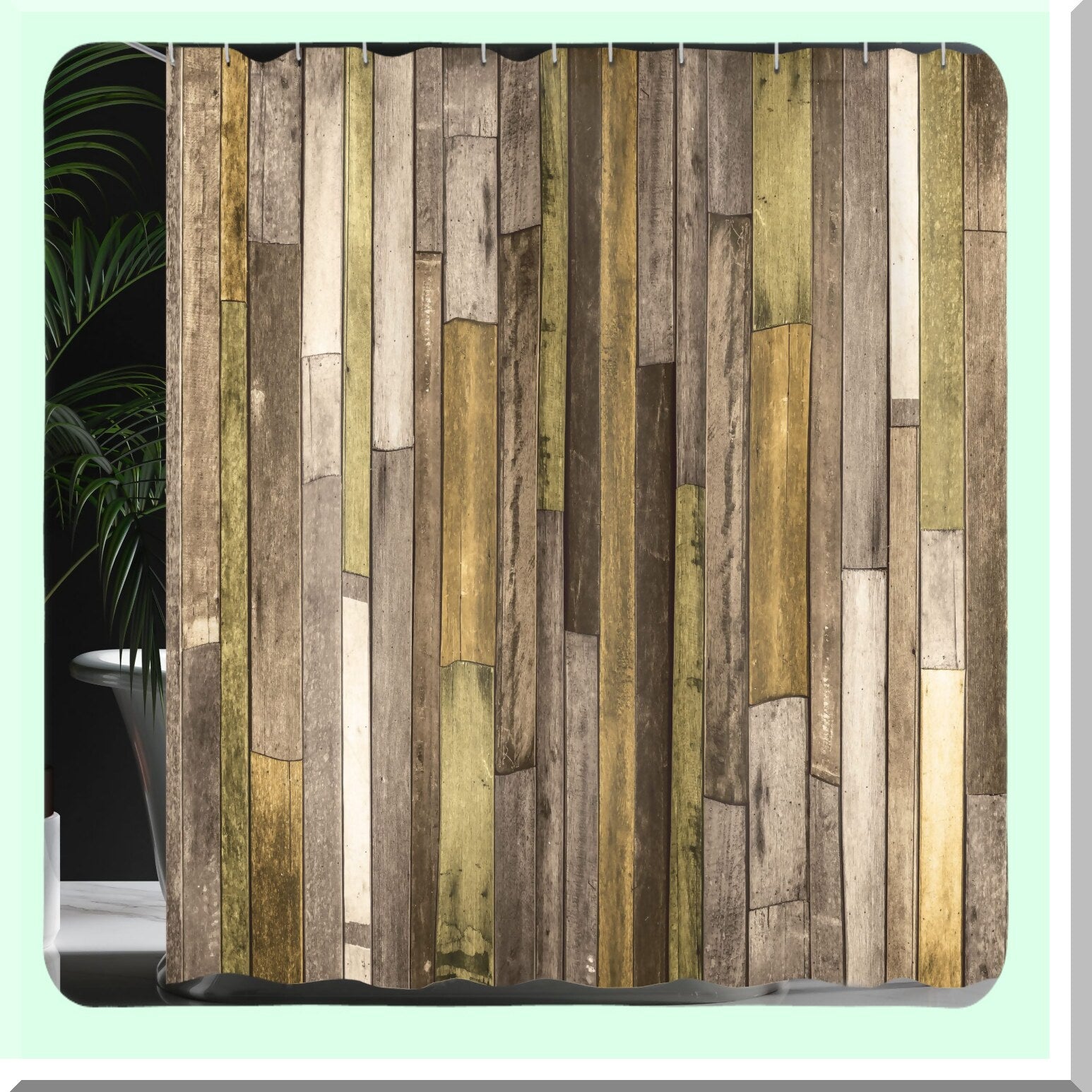 Transform your bathroom with this wooden print shower curtain featuring a brown old hardwood floor plank grunge lodge design. Measuring 69 inches wide by 70 inches long, it offers a perfect fit for most showers. Crafted from cloth fabric, this decor set includes hooks for easy installation. The high-resolution digital printing creates a realistic, 3D-like appearance, adding depth and character to your space. Its water-resistant material dries quickly after use, making maintenance simple. The design's natural rural graphic evokes a warm, rustic ambiance, ideal for enhancing bathrooms, powder rooms, or guest suites. The curtain's colors are vibrant and resistant to fading, ensuring long-lasting beauty. Whether updating your own space or searching for a thoughtful gift, this shower curtain provides a quick, stylish refresh to any bathroom decor. Manual measurement may result in slight discrepancies, and color variations may occur due to monitor differences.