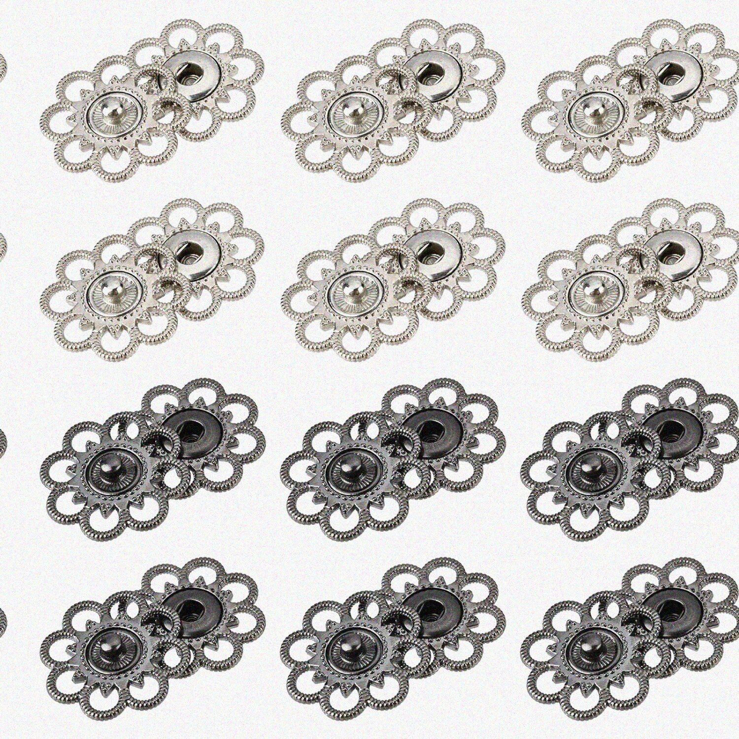 This set includes 20 sets of 1-inch alloy flower snap buttons available in two assorted colors: gunmetal and platinum. Each set contains 10 snap buttons, totaling 20 sets. The buttons are smooth, flat, and comfortable to feel, offering a simple and fashionable look. Designed for sewing and household projects, these metal press fasteners are easy to sew onto clothing, woolen coats, sweaters, windbreakers, or other fabric items. The flower hollow alloy snap buttons measure approximately 1 inch (25mm) in diameter. They come organized in a plastic bead container measuring 12.5x8.5x1.8cm, with one container included. Please note that slight color differences may occur due to lighting and monitor settings. The product size may appear larger in images, so attention to actual dimensions is recommended. Feel free to contact us if there are any quality concerns.