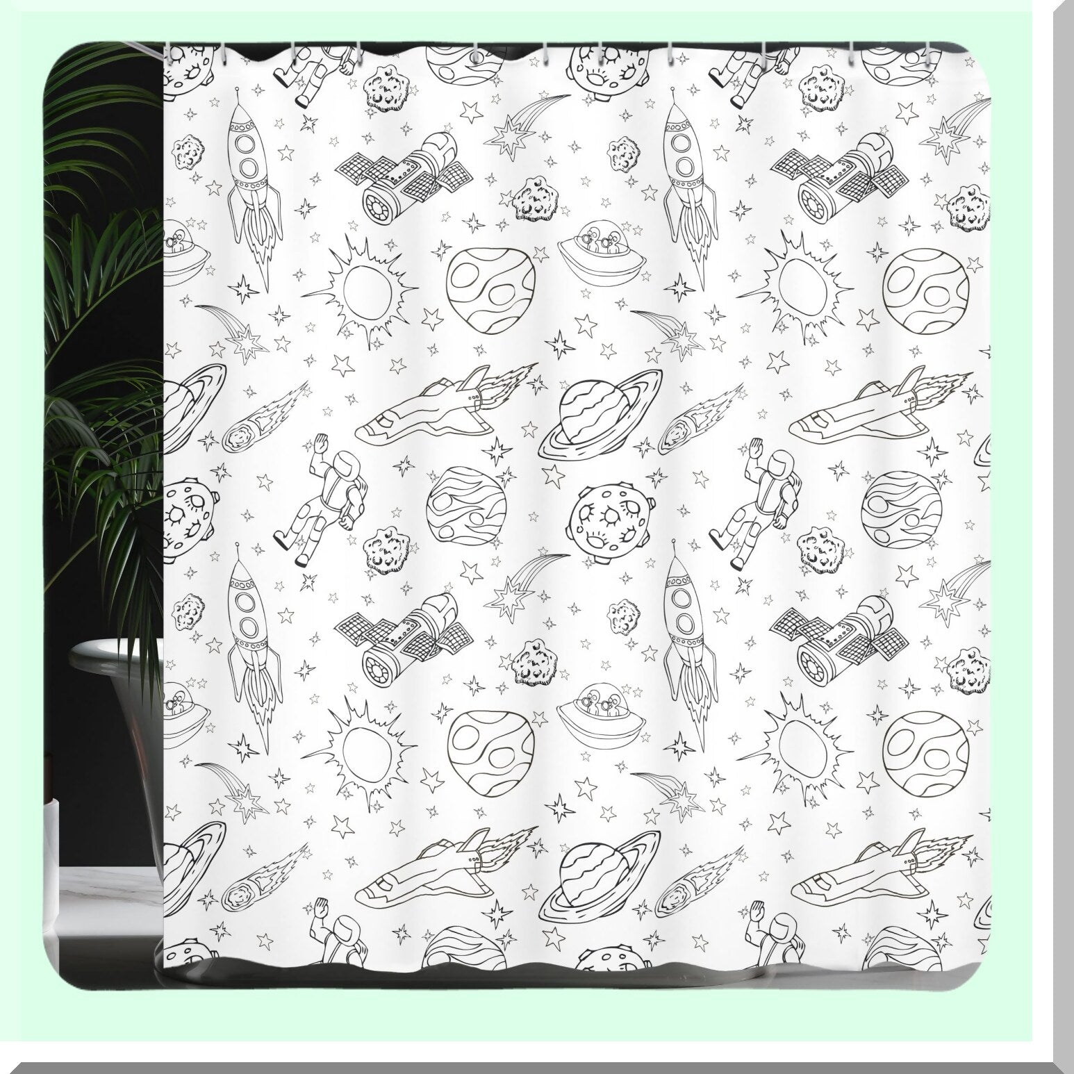 Transform your bathroom with this playful and decorative shower curtain featuring a space-themed design. Measuring 75 inches long and 69 inches wide, it offers a vibrant and modern look that complements various bathroom accessories such as towels, rugs, and mats. The high-resolution digital printing creates a realistic, 3D-like appearance, adding depth and value to your decor. Made from a durable cloth fabric, the curtain is water-resistant and dries quickly after use, ensuring practicality and longevity. Its design showcases doodles of astronauts, planets, shooting stars, and other space elements, creating an engaging and imaginative atmosphere. The curtain is easy to install with included hooks, making it a quick way to refresh your bathroomโs appearance without significant expense. Perfect for personal use or as a thoughtful gift, this curtain brings a fun, science fiction-inspired touch to any bathroom space. Please allow slight measurement discrepancies due to manual measurement.