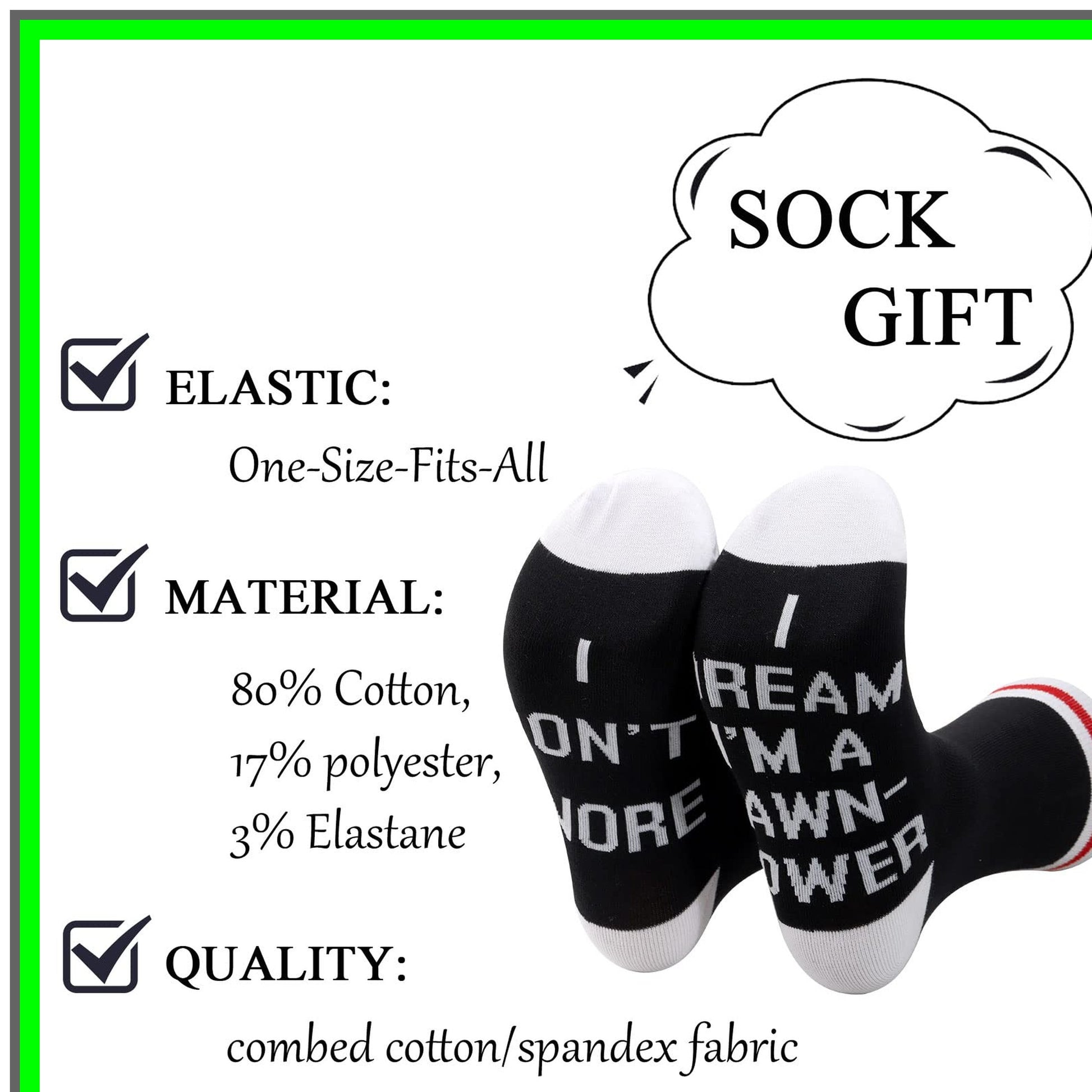 Introducing the ultimate gift for the gardening enthusiast in your life: the "I Don't Snore, I Dream I'm a Lawn-Mower" socks! Perfect for husbands, dads, and grandpas who take pride in their landscaping skills, these whimsical socks combine comfort with a touch of humor. Crafted from a soft, breathable fabric, these socks are designed for all-day wear, whether you're tending to your garden, mowing the lawn, or simply relaxing at home. The playful design features vibrant colors and a fun lawn-mower graphic, making them a standout addition to any casual outfit. These socks are not just a practical accessory; they are a conversation starter! Ideal for birthdays, Father's Day, or just because, they make a thoughtful gift for anyone who loves to dig in the dirt and cultivate their outdoor space. Show your appreciation for their green thumb with a present that reflects their passion for gardening and landscaping.With a snug fit and durable construction, these socks are perfect for both indoor and outdoor activities. They provide the comfort needed for long hours spent in the garden while adding a dash of personality to any gardening attire. Whether your loved one is a seasoned landscaper or a weekend warrior, these socks will surely bring a smile to their face. Celebrate their love for gardening and lawn care with a gift thatβs as unique as they are. Order the "I Don't Snore, I Dream I'm a Lawn-Mower" socks today and let them step into their gardening dreams!