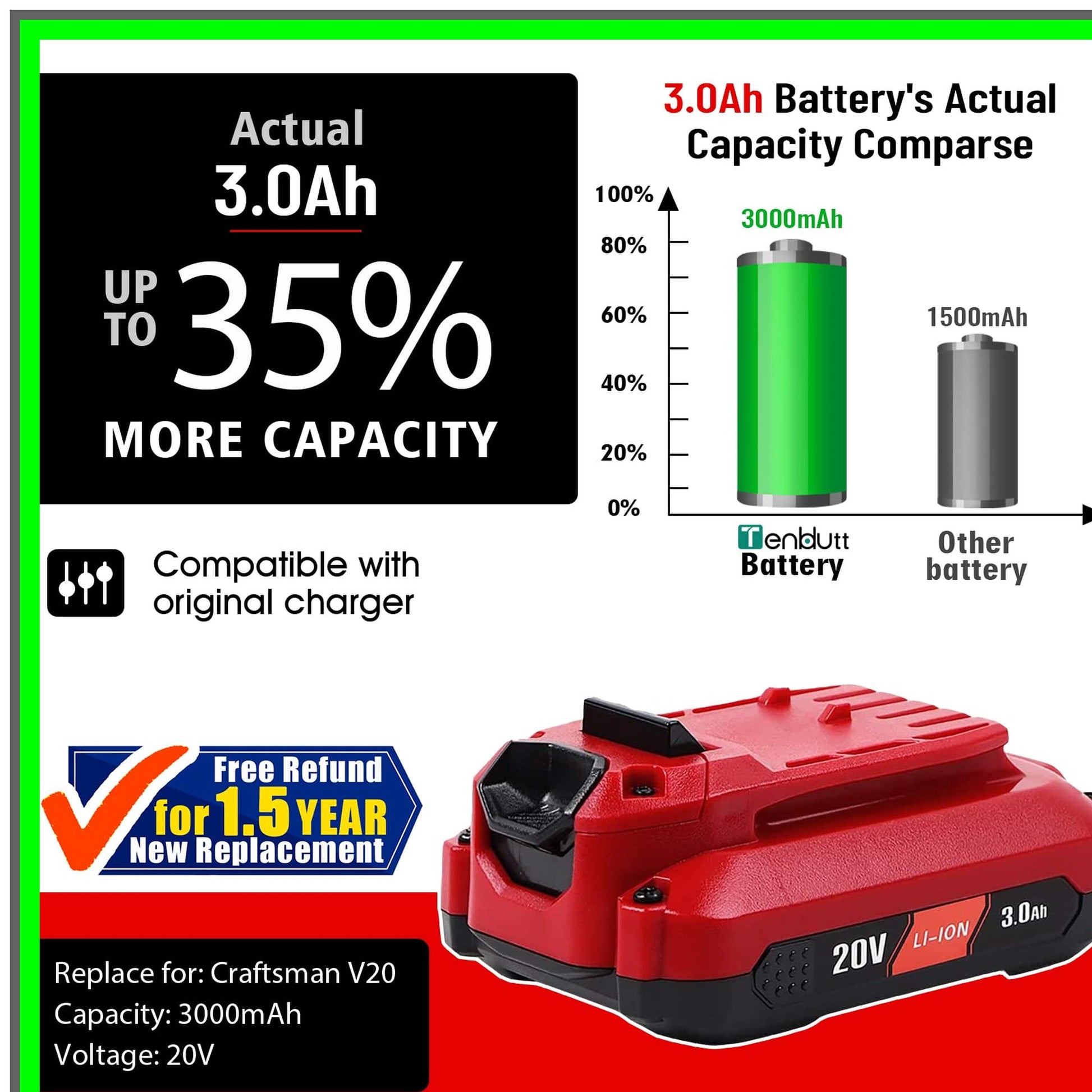 Elevate your power tool performance with this exceptional 2 Pack of 20V 3.0Ah Replacement Lithium Ion Batteries, designed specifically for your 20V cordless power tools. Engineered for efficiency and longevity, each battery boasts a robust capacity of 3000mAh and a voltage of 20V, delivering a total of 60 watt-hours of reliable energy. These batteries are compatible exclusively with the V20 MAX series, ensuring seamless integration with a variety of tools including chainsaws, impact wrenches, drills, and more. Whether you're tackling heavy-duty projects or simple home repairs, these batteries provide the power you need to get the job done without interruption. Key features include:- **High Capacity**: 3000mAh for extended run time.- **Versatile Compatibility**: Works with V20 MAX tools like the cordless chainsaw, impact wrench, lopper, pole saw, and more.- **Durable Design**: Built to withstand the rigors of daily use, ensuring you can rely on them for all your projects.To maintain optimal performance, follow simple care instructions: keep the batteries away from heat and metal objects, fully discharge and recharge them monthly during storage, and avoid leaving them on the charger when not in use. Included in your purchase are two high-performance 20V 3000mAh MAX Lithium Ion Batteries and a user manual to guide you through setup and maintenance. Upgrade your toolkit today and experience the difference in power and efficiency with these essential batteries! Perfect for DIY enthusiasts and professionals alike, this battery pack is your go-to solution for all your cordless power tool needs.