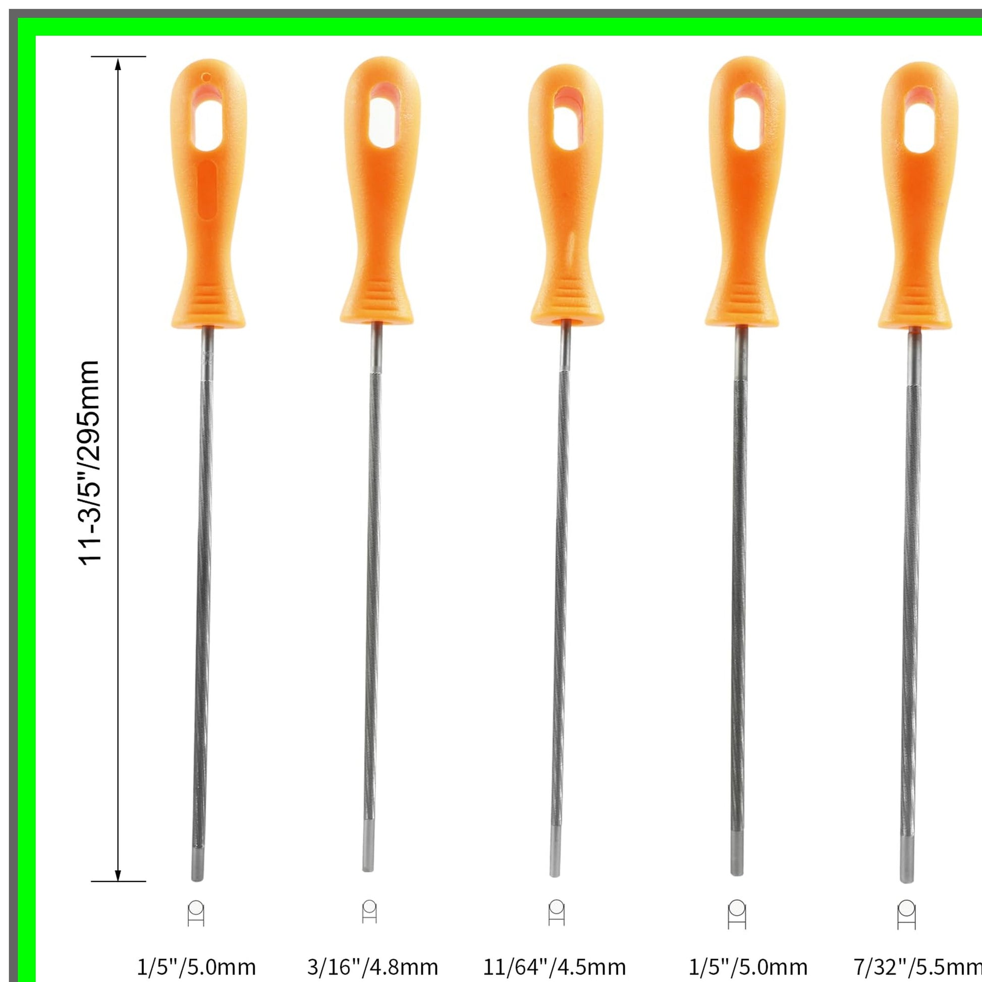 Elevate your chainsaw maintenance with our premium Chainsaw File Set, meticulously designed for both professionals and DIY enthusiasts. Crafted from high-quality steel, this set ensures durability and precision, allowing you to keep your chainsaw in optimal condition for efficient cutting performance.This comprehensive set includes five essential file sizes: 5/32", 7/32", 3/16", 11/64", and 1/5". Each file is expertly engineered to sharpen your chainsaw teeth with ease, enhancing the longevity of your tool and improving cutting efficiency. The vibrant orange handles not only provide a pop of color but also ensure a secure grip, making your sharpening tasks comfortable and safe.Whether you're tackling a weekend project or maintaining your equipment for professional use, this Chainsaw File Set is your go-to solution for achieving a razor-sharp edge. The compact design allows for easy storage and portability, so you can take it wherever your cutting needs arise.Please note that colors may vary slightly due to different display settings, and a minor measurement error of 1-2mm may occur during production. Rest assured, this set is designed with your satisfaction in mind, providing an exceptional value for your investment.Choose our Chainsaw File Set for a reliable, efficient, and enjoyable sharpening experience. Trust in our commitment to quality and customer satisfaction, and make your chainsaw maintenance a breeze!