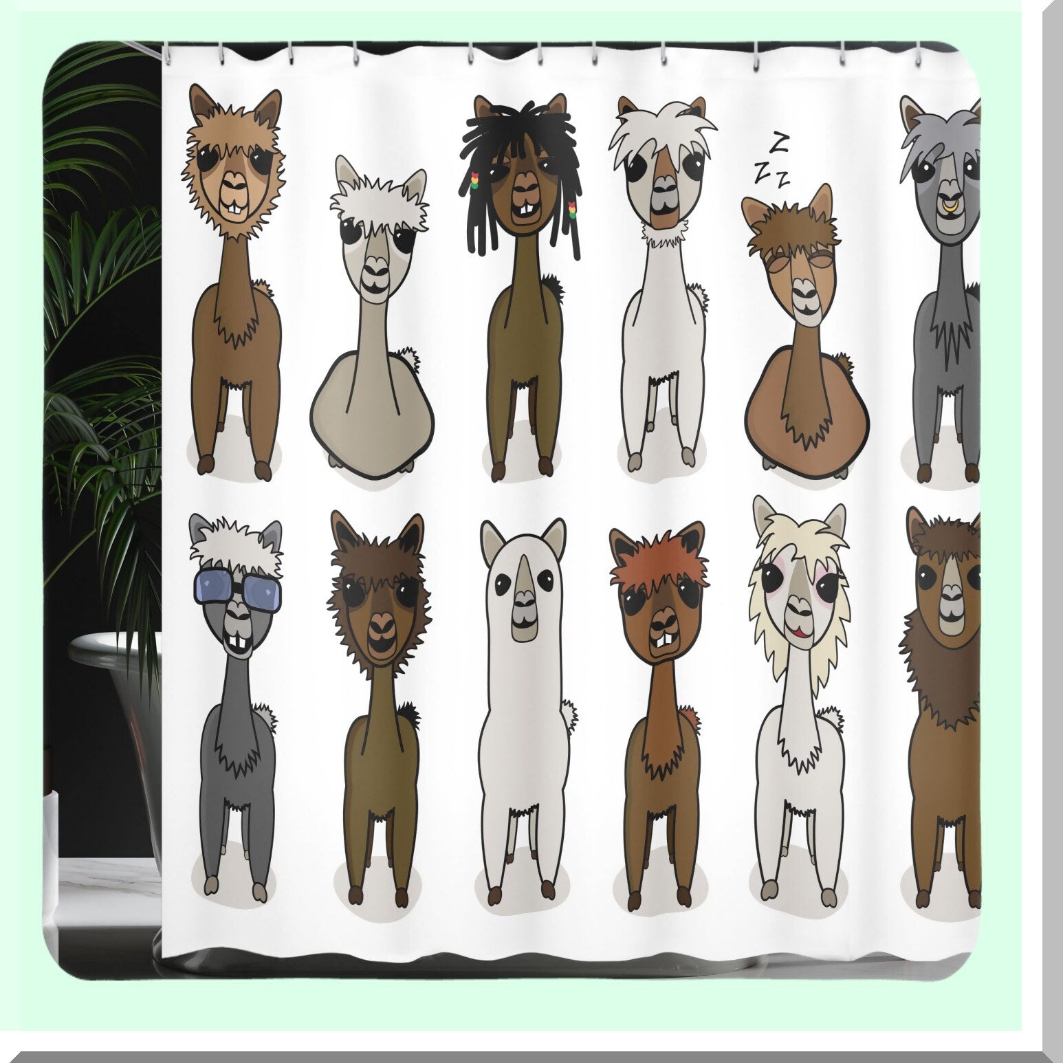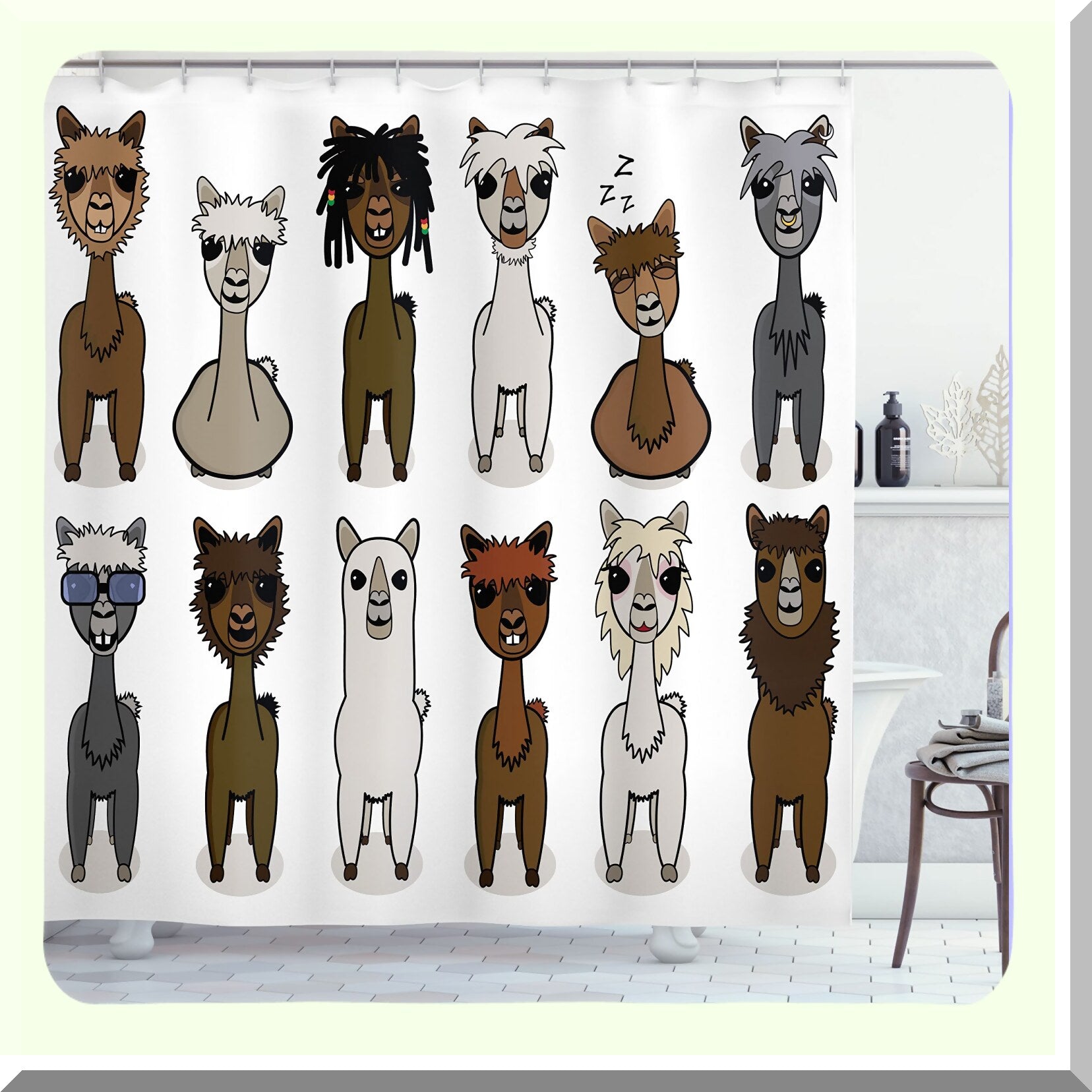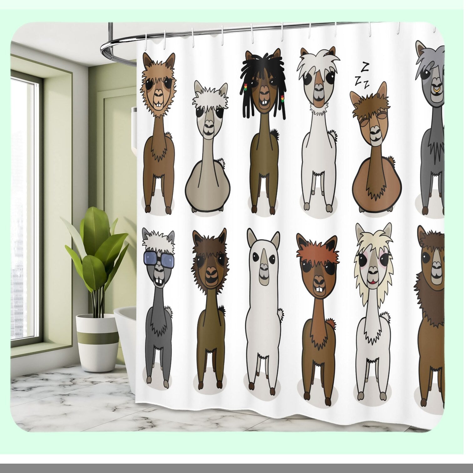 Transform your bathroom with this charming shower curtain featuring charismatic alpacas with different hairs in a playful animal fiction comic artwork. Crafted from cloth fabric, it measures 69 inches wide by 70 inches long, providing ample coverage. The high-resolution digital printing creates a realistic, 3D-like appearance, adding depth and vibrancy to your space. Its water-resistant design ensures quick drying after showers, maintaining a fresh look. The curtain's colors are fade-resistant, preserving their brightness over time. Perfect for updating bathrooms, powder rooms, or guest suites, it complements various decor styles and color schemes. The set includes hooks for easy installation. Whether for personal use or as a thoughtful gift, this curtain brings a fun, lively touch to any bathroom. Manual measurement may result in slight discrepancies, and color variations may occur due to monitor differences. Elevate your bathroom decor with this unique, eye-catching piece.