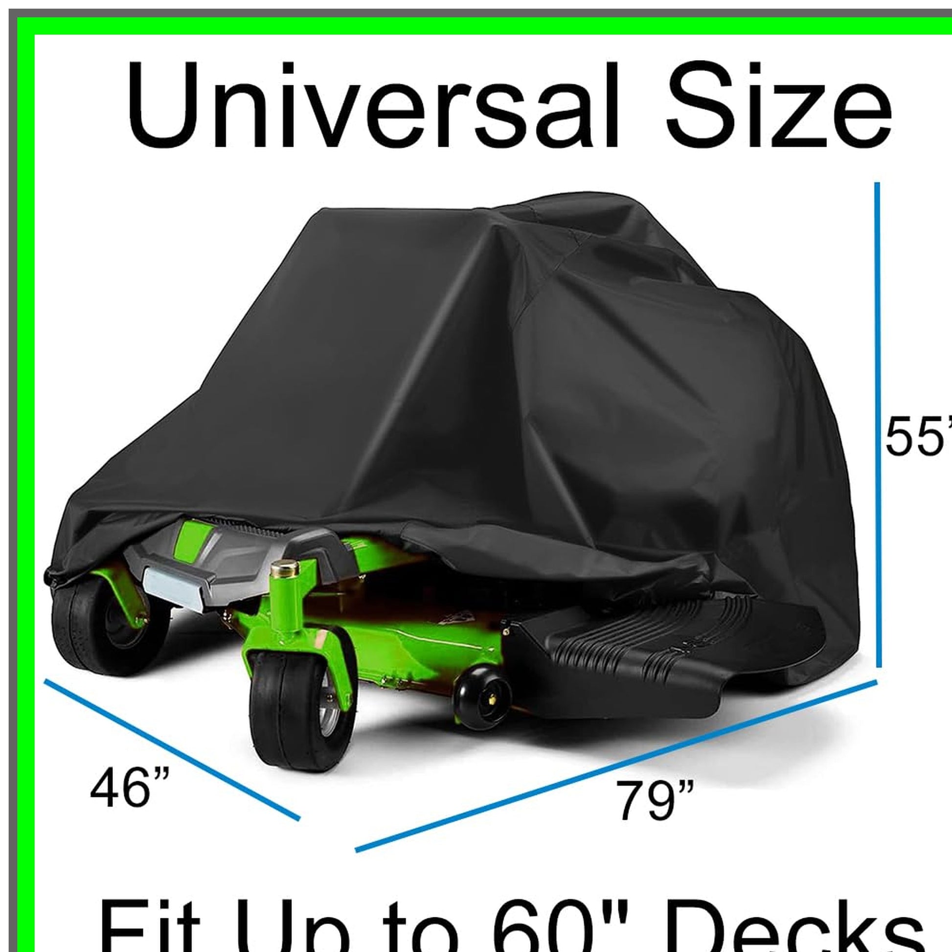 Introducing the ultimate solution for safeguarding your outdoor zero-turn mower: a premium waterproof cover designed for universal fit on mower decks up to 60 inches. Measuring 79" x 46" x 55" (L x W x H), this cover is engineered to provide all-around protection against the elements, ensuring your mower remains in pristine condition year-round.Crafted from durable 210D Oxford cloth with a robust PU coating, this cover is built to withstand harsh weather conditions, including ice, snow, rain, wind, and intense sunlight. Its waterproof design prevents moisture buildup, while the UV protection shields your mower from sun damage, fading, and cracking. Say goodbye to scratches and dust accumulation; this cover acts as a reliable barrier against dirt, leaves, and debris, keeping your equipment clean and ready for action.Installation is a breeze, thanks to the universal fit that accommodates a wide range of zero-turn mowers. Before purchasing, we recommend measuring your mower to ensure a perfect fit. The cover is lightweight yet sturdy, making it easy to put on and take off whenever needed.We pride ourselves on exceptional customer service. If you have any questions or concerns, our dedicated support team is here to assist you with free returns and exchanges, ensuring your complete satisfaction. Protect your investment and extend the life of your mower with this essential accessory. Experience peace of mind knowing your mower is shielded from the elements, ready to tackle your lawn care needs whenever you are.
