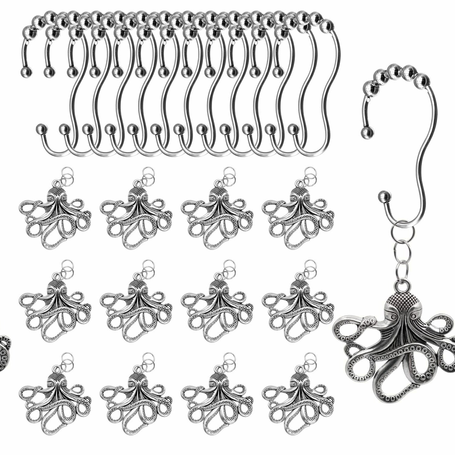 This set includes 12 stainless steel shower curtain hooks rings featuring an octopus decorative pendant with a creative ocean cartoon theme. Each hook measures 2.75 inches in length and 1.53 inches in width, designed for easy hooking and hanging without difficulty. The hooks are suitable for shower curtain rods with a diameter of 22-25mm (0.8-1.1 inches). Made from durable stainless steel, these hooks combine functionality with a playful ocean-inspired design, adding a decorative touch to your bathroom. The set provides a practical and stylish solution for hanging shower curtains, ensuring smooth operation and a secure hold. Perfect for enhancing the aesthetic of your bathroom while maintaining ease of use.