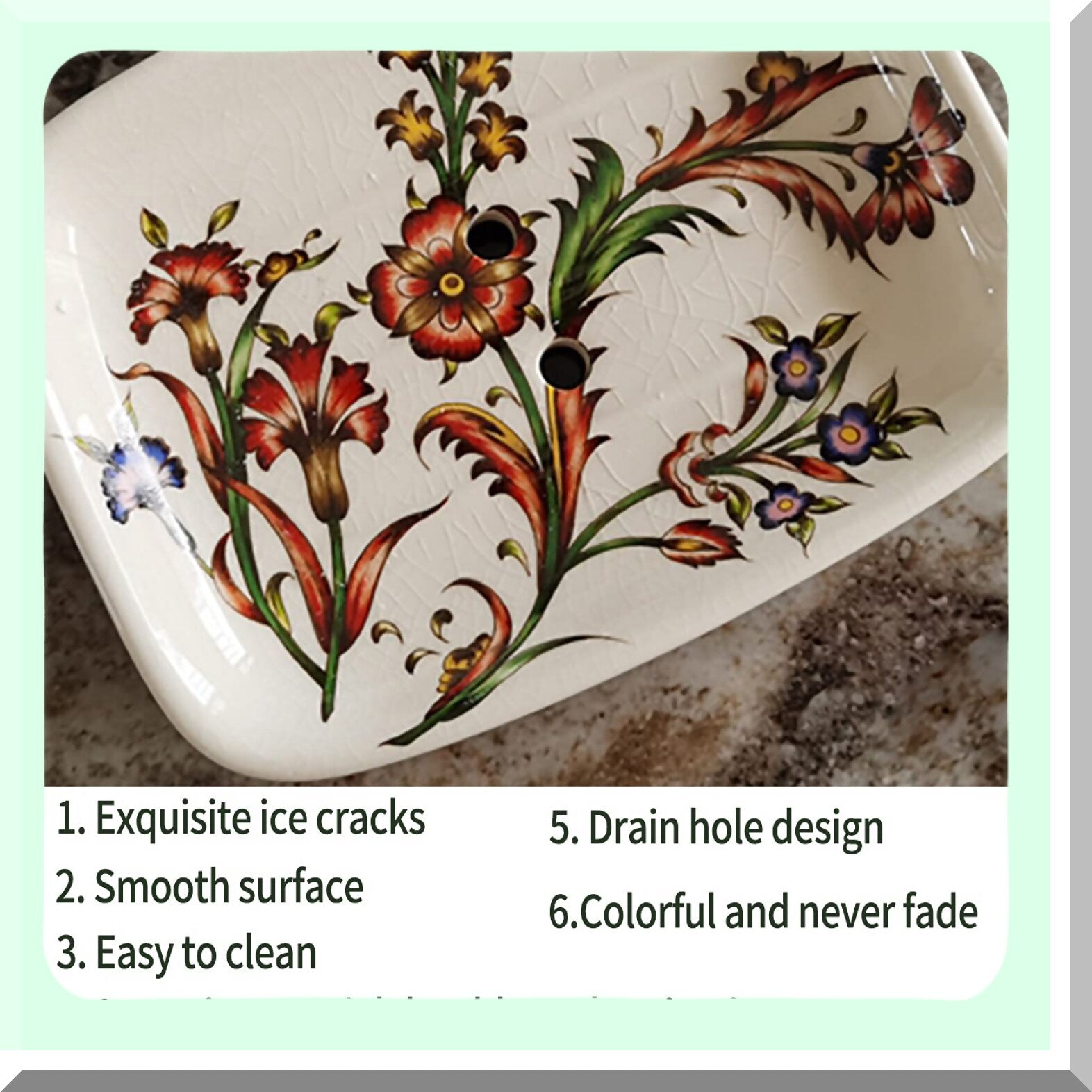 This ceramic soap dish features a creative ice crack design with a vibrant red flower pattern, adding a touch of elegance to your bathroom or shower. Made from durable, high-quality ceramic, it offers a longer lifespan compared to plastic alternatives. The dish measures 5.5 x 4.3 x 1.2 inches and weighs approximately 10 ounces. It includes two draining holes to keep soap dry and clean, preventing residue buildup. Its versatile design allows it to be used in bathrooms, kitchens, wash basins, bathtubs, or on countertops. Additionally, it can serve as a small jewelry storage box. The elegant and generous style enhances the aesthetic of any space, making it a practical and beautiful addition to your home. This soap dish combines functionality with decorative appeal, making it a thoughtful gift for family or loved ones.