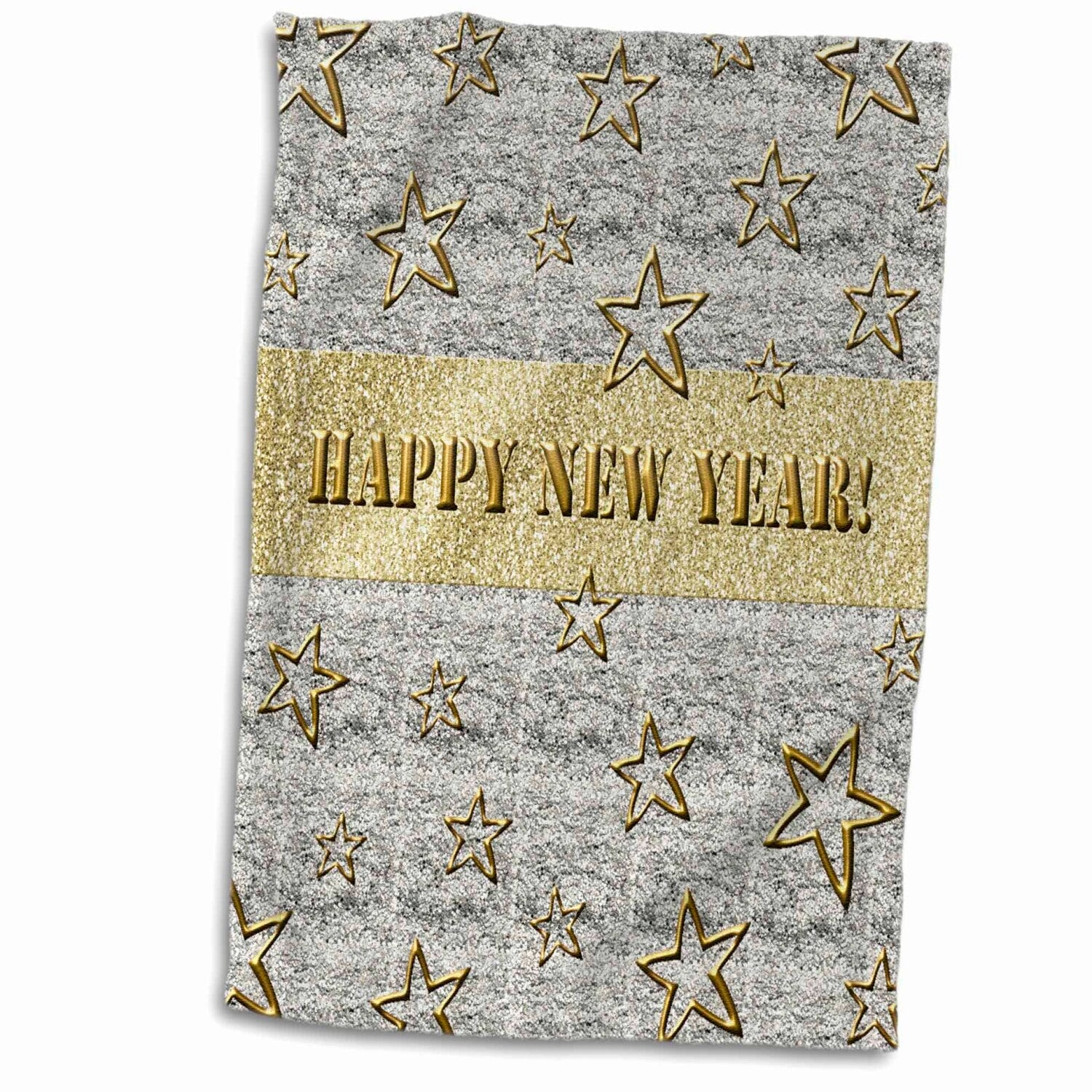 This 15" x 22" hand towel features a textured silver background with gold "Happy New Year" lettering and star designs. It is versatile for use in the kitchen, bathroom, or gym. Ideal for drying dishes, hands, and faces, it is also suitable for carrying in any sports bag. The towel is designed to regain its fullness after the first wash, ensuring long-lasting softness and absorbency. Its durable construction makes it a practical addition to any setting, providing reliable performance whether at home or on the go. The stylish design adds a festive touch, making it suitable for celebrating special occasions or everyday use. Easy to care for, this towel combines functionality with a decorative appeal, making it a convenient and attractive choice for various needs.