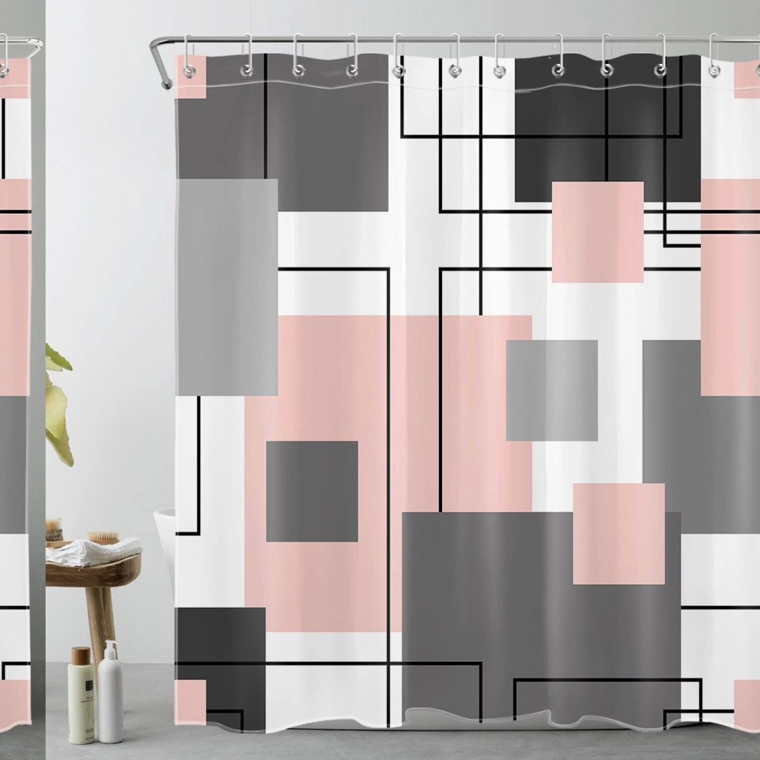 This abstract modern shower curtain features a black and white geometric design with grey and pink accents, measuring 72 inches by 72 inches to fit most standard shower stalls or bathtubs. Made from waterproof polyester fabric, it dries quickly and does not require a liner. The package includes one shower curtain and twelve hooks. Its multifunctional design allows it to be used beyond the bathroom as a door curtain, kitchen curtain, window curtain, wall art, tapestry, photo backdrop, tablecloth, or party decor. The curtain effectively prevents water spray during showers, offers privacy, and adds a stylish touch to any space. Its unique design can refresh your bathroom and brighten your day. The curtain is not too thin or thick, ensuring durability and ease of use. It is a versatile decor piece suitable for various themes and occasions, making it a thoughtful gift for loved ones. Please note slight color variations may occur due to display differences.