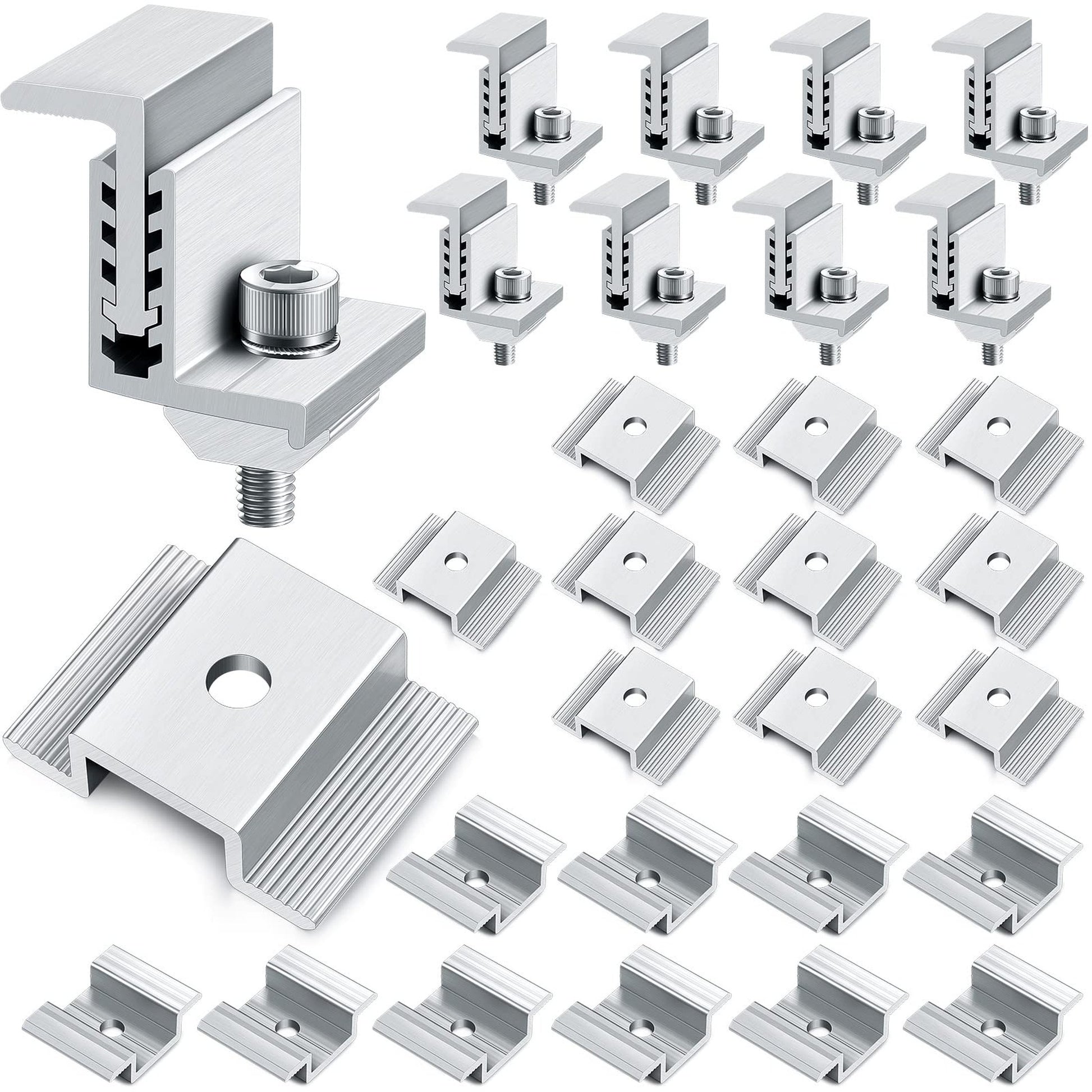 Installation is a breeze with our user-friendly design. Simply position the clamps in your desired location, and enjoy the peace of mind that comes with a solid, stable connection. Each package includes 20 mid clamps and 8 adjustable end clamps, giving you everything you need for a comprehensive setup.