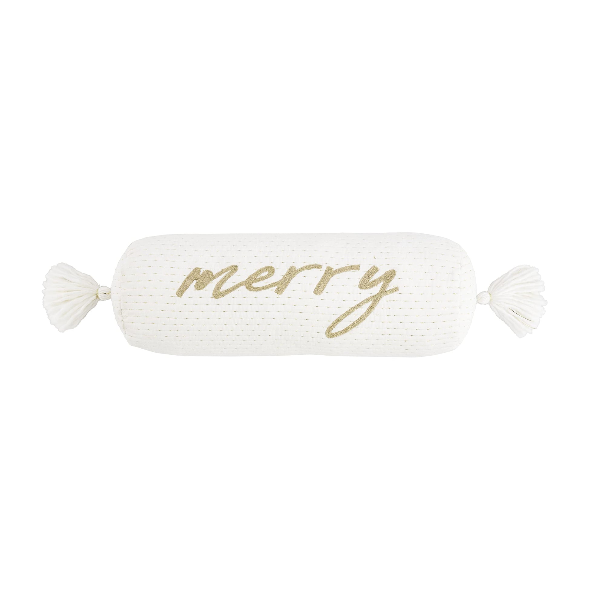 Want to add an elegant touch to your home for the holidays? Try out our Velvet Bolster with Tels. The simple Appliqud velvet bolster pillow features silver chenille yarn side tels. The pillow reads merry" in gold cursive writing. Measures 24"x8"dia