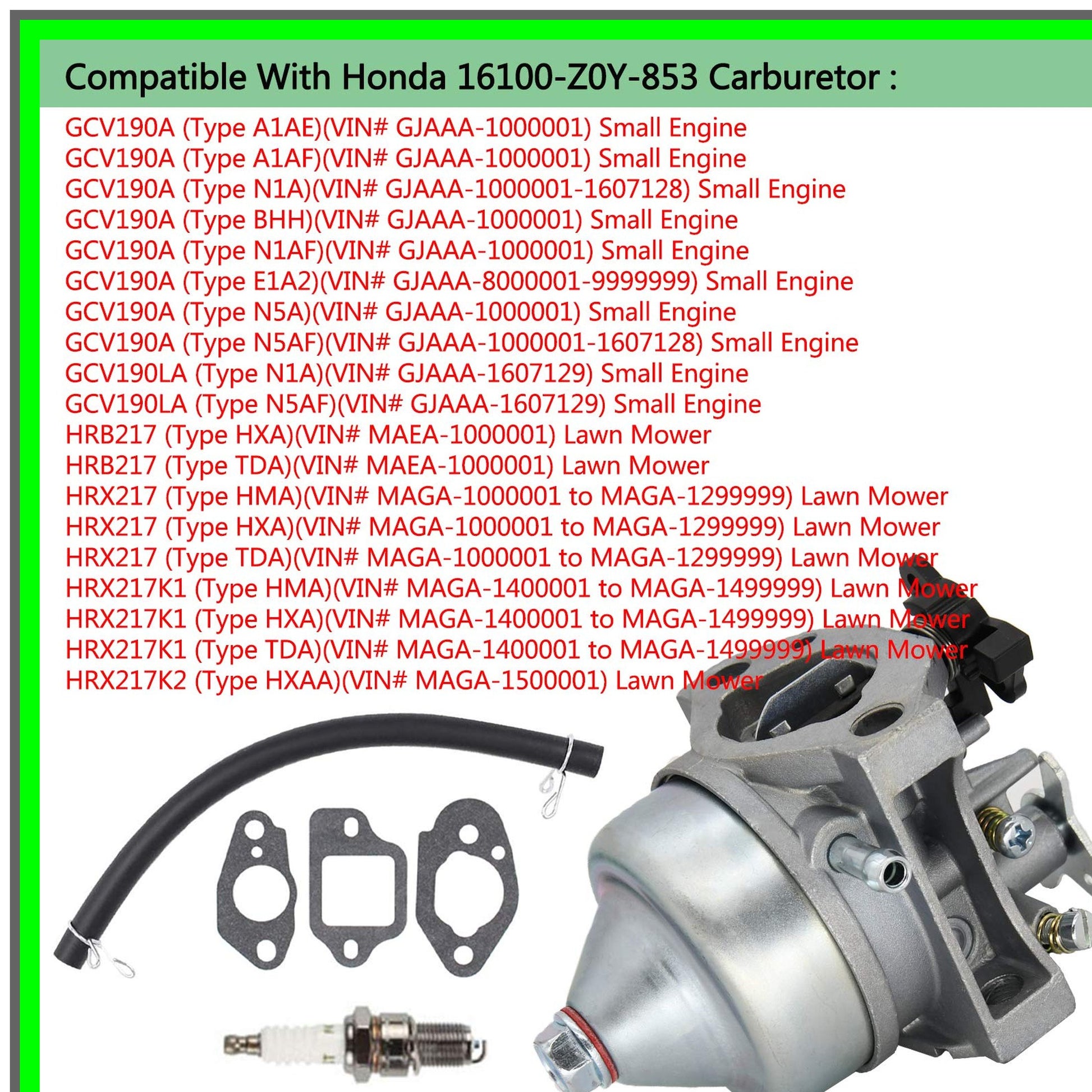 Revitalize your small engine with our high-performance carburetor, expertly designed to replace the GCV190A and GCV190LA models. This precision-engineered component ensures optimal fuel delivery and combustion efficiency, enhancing the performance of your lawn mower or small engine equipment. Compatible with a wide range of models, including GCV190A A1AE, GCV190A N5AF, and GCV190LA SBA, this carburetor is the perfect solution for restoring your engine's power and reliability.Crafted with durability in mind, our carburetor meets or exceeds OEM specifications, ensuring a seamless fit and function. The package includes essential components: one carburetor, three gaskets, a spark plug, and an air filter, providing everything you need for a complete overhaul. Whether you're tackling yard work or maintaining your equipment, this carburetor will help you achieve peak performance.Before making your purchase, verify compatibility with your specific engine model using the provided part numbers: 16100-Z0Y-013, 16100-Z8D-911, and others. This attention to detail guarantees that you receive the right part for your needs, minimizing downtime and maximizing efficiency.Upgrade your engine's performance today with our reliable carburetor replacement. Experience smoother operation, improved fuel efficiency, and enhanced power output, making your lawn care tasks easier and more enjoyable. Don’t let a faulty carburetor hold you back—invest in quality and performance that you can trust. Order now and get your engine running like new!