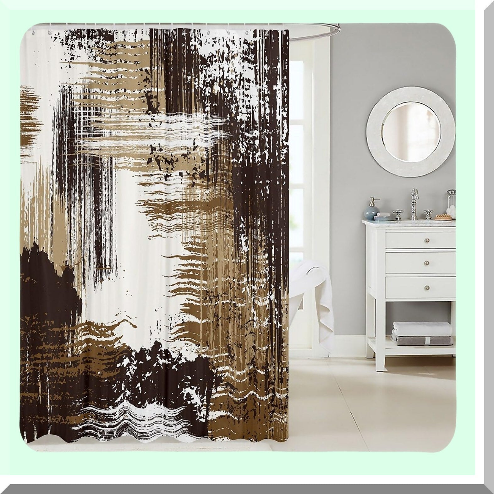 This modern abstract art bathroom curtain features a grunge style design in brown, black, and grey tones, adding a contemporary touch to any bathroom. Made of 100% polyester fabric, it is waterproof, durable, wrinkle-resistant, and maintains its shape well. The vibrant digital print enhances its visual appeal, while the eco-friendly ink ensures a safe environment. The curtain measures 72 inches wide by 72 inches long and includes 12 hooks for easy hanging. Its design allows light to pass through while providing privacy, making it suitable for bathrooms, windows, balconies, or other spaces. The versatile pattern complements various bathroom accessories such as towels, rugs, and mats, creating a cohesive look. Easy to clean with machine wash or damp cloth wipe, this curtain is a practical and stylish addition to any home. It also makes a thoughtful gift for loved ones.