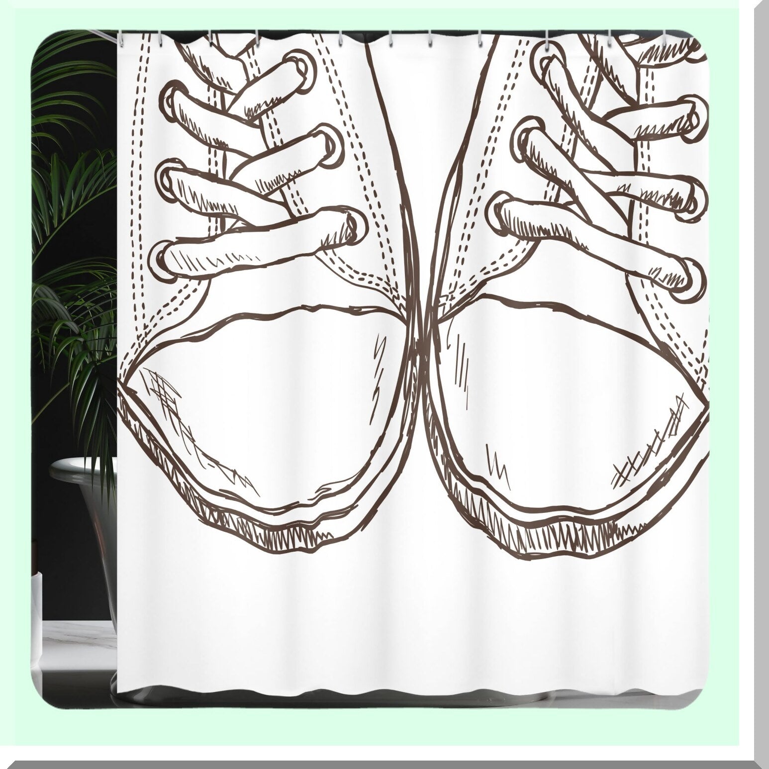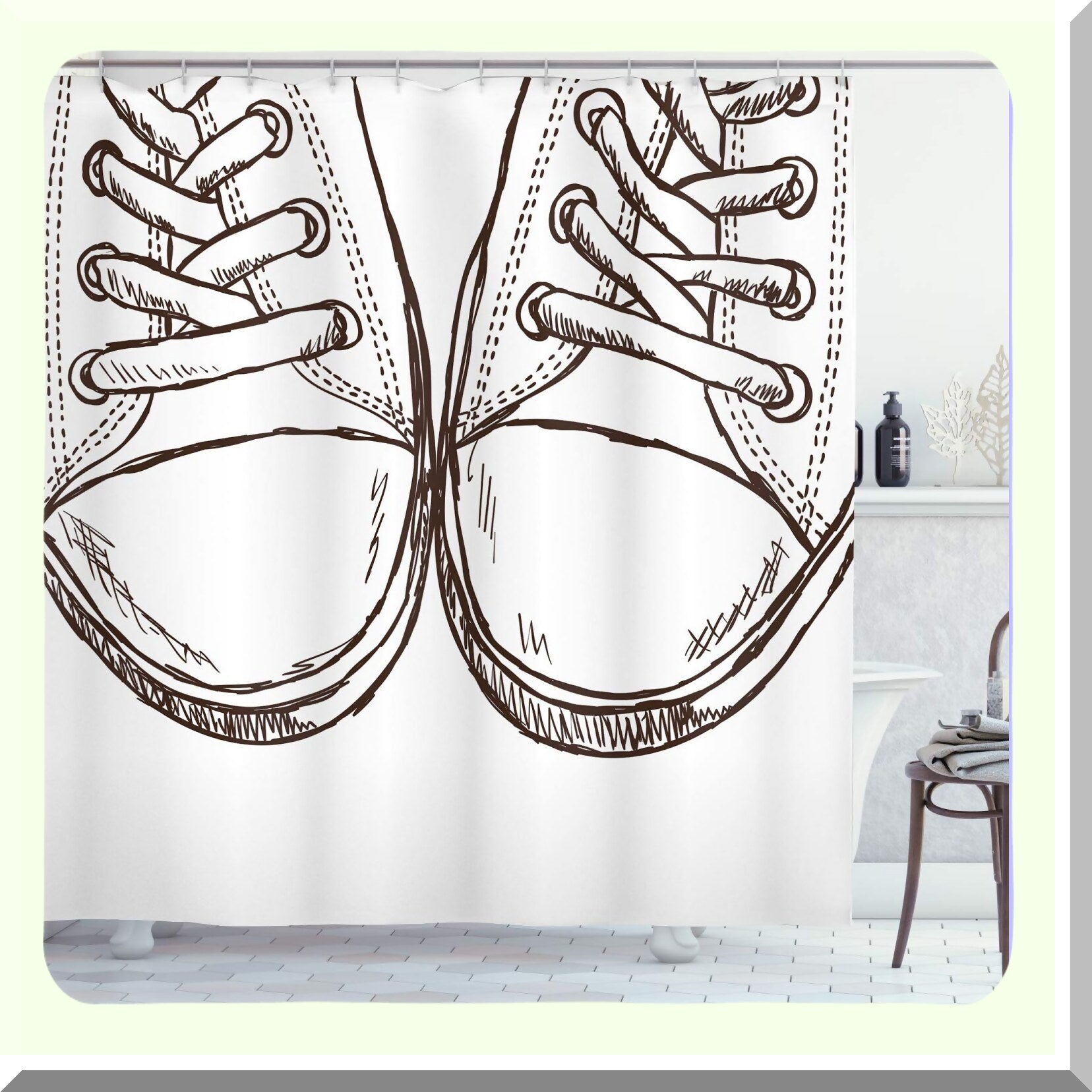 Transform your bathroom with this stylish shower curtain featuring a sneakers in hand drawing style. Designed with a casual footwear theme, it captures an urban lifestyle vibe perfect for teenagers and young adults. Made from durable cloth fabric, the curtain measures 69 inches wide by 70 inches long, providing ample coverage. Its high-resolution digital printing creates a realistic, 3D-like appearance, adding depth and character to your space. The colors, a blend of dark brown and white, are resistant to fading, ensuring long-lasting vibrancy. Water-resistant and quick-drying, this curtain is practical for everyday use. It comes with hooks for easy installation, making it a quick way to refresh your bathroom decor. Whether updating a guest bathroom or personal space, this curtain offers a modern, trendy look that complements various bathroom accessories. Perfect as a gift or personal upgrade, it brings a unique touch to any bathroom setting.