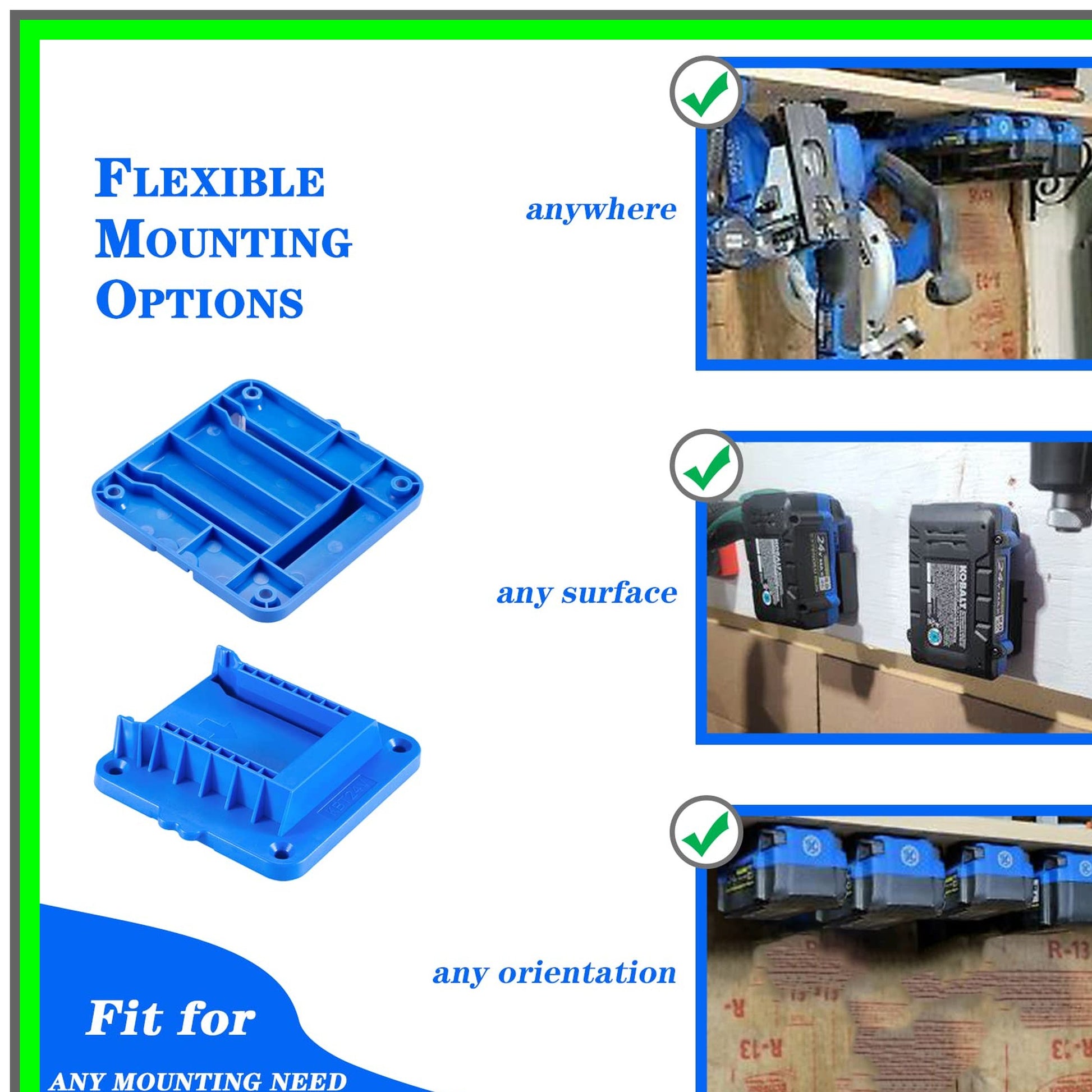 Introducing the ultimate solution for organizing your workspace: the versatile battery mount holder designed specifically for Kobalt 24V Max batteries. This innovative accessory is compatible with models such as KB624-03, KB524-03, KB424-03, and KB224-03, ensuring a perfect fit for your power needs.Crafted for convenience and durability, this battery holder allows you to mount your batteries securely on any wall at your desired angle. With two strategically placed screw holes, installation is a breeze—simply attach it to your wall and slide your battery into the groove for a snug, secure fit. Say goodbye to clutter and the risk of battery falls; this holder keeps your batteries safe and easily accessible.Each package includes six robust holders and twelve screws, providing you with everything you need to set up your battery storage system. Whether you're a DIY enthusiast, a professional tradesperson, or simply someone who values organization, this battery mount holder is an essential addition to your toolkit.Optimize your workspace and enhance your efficiency with this practical and stylish battery holder. Its sleek design not only saves space but also adds a touch of professionalism to your garage, workshop, or shed. Keep your Kobalt batteries organized and ready for action with this reliable and user-friendly solution. Don’t let disorganization slow you down—invest in the battery mount holder that combines functionality with ease of use. Perfect for home improvement projects, maintenance tasks, or any job that requires reliable power, this holder is your go-to accessory for a tidy and efficient workspace.