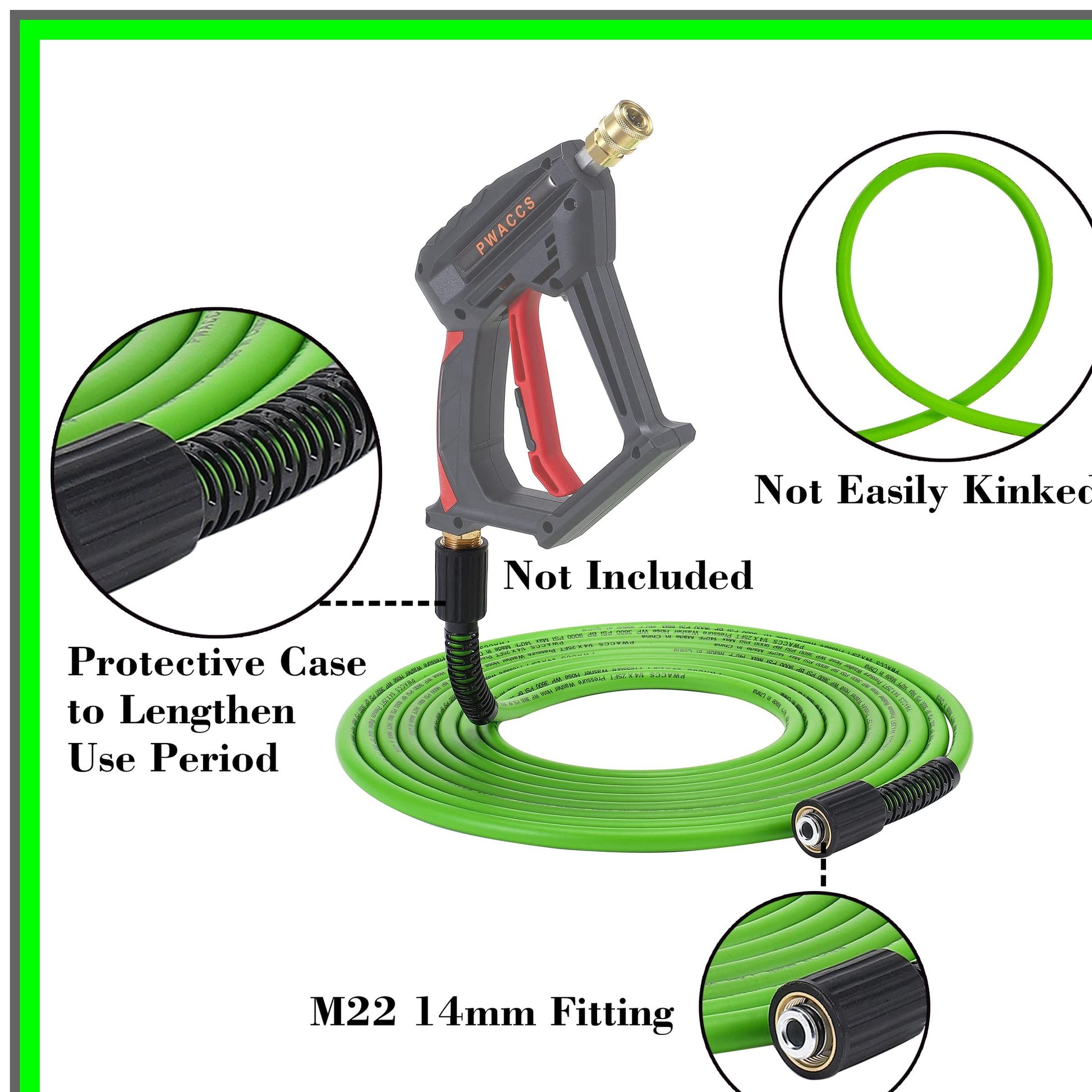 Revitalize your outdoor cleaning routine with our high-performance Pressure Washer Hose, designed to elevate your power washing experience. This essential tool is perfect for tackling tough grime, dirt, and stains on various surfaces, making it a must-have for homeowners and professionals alike. Crafted for durability and efficiency, this 25-foot hose features a robust construction that withstands a rated working pressure of 3600 PSI and temperatures up to 140°F (60°C). The 1/4-inch fitting with M22 14mm compatibility ensures a secure connection to your pressure washer, allowing for seamless operation. Whether you're cleaning driveways, patios, decks, or vehicles, this hose delivers the power and flexibility you need to get the job done quickly and effectively.Please note that this hose is specifically designed for use with pressure washers and is not suitable for garden hoses or direct faucet connections. If your pressure washer has an M22 14mm or 15mm male water outlet fitting, simply connect it to our hose for immediate use. For those seeking a quick connect option, compatible adapters are available for purchase.Our Pressure Washer Hose also serves as an excellent repair kit for your existing pressure washer attachments, or as an extended hose to replace your old, worn-out one. With our commitment to quality and customer satisfaction, our dedicated support team is ready to assist you with any inquiries or concerns, ensuring you have a smooth and enjoyable experience.Transform your cleaning tasks into a breeze with this reliable and efficient pressure washer hose, and enjoy the satisfaction of a refreshed and pristine outdoor space.