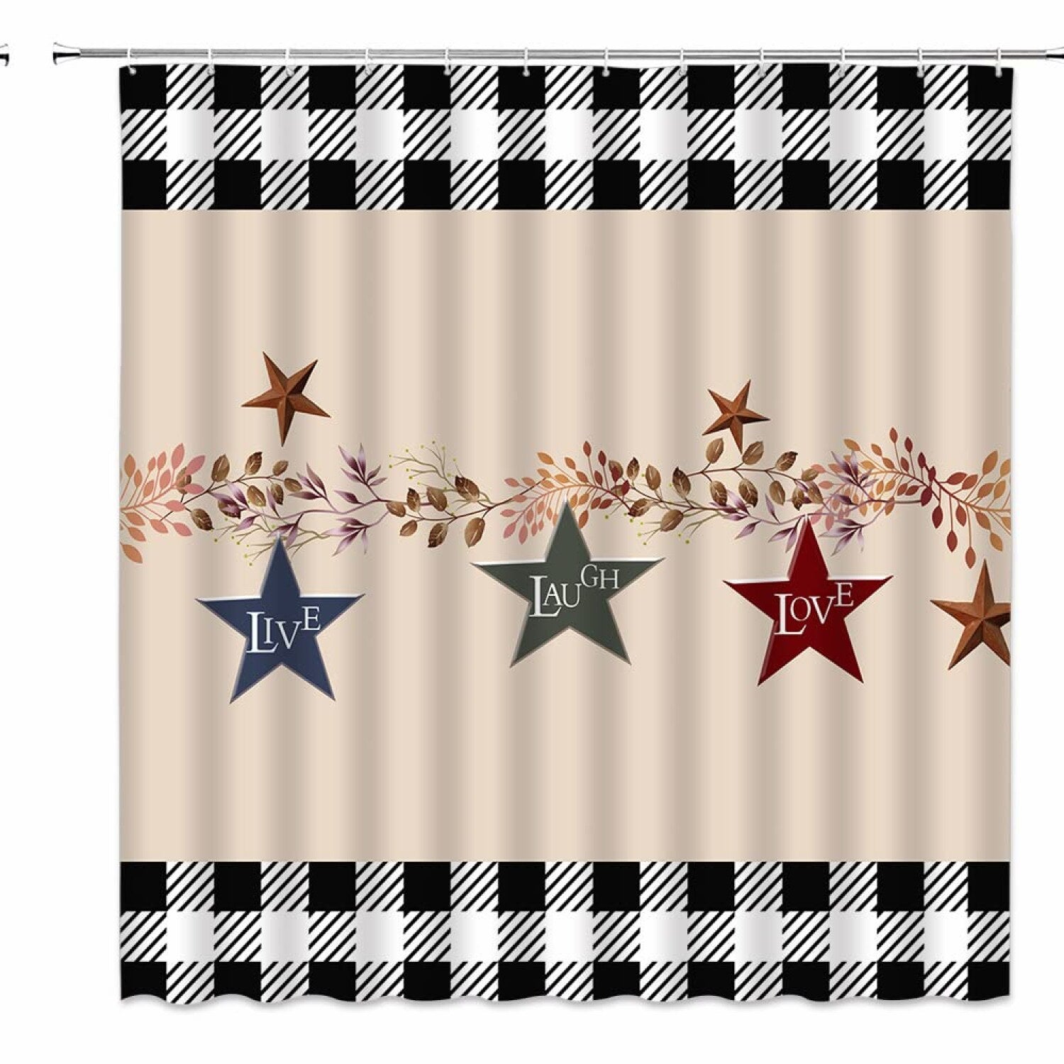 This rustic farmhouse shower curtain features a black and white buffalo check plaid design with a vintage country western style, accented by a rusty star. Made from polyester fabric, it measures 70" wide by 70" high and includes 12 plastic hooks for easy installation. The curtain is foldable, so creases may be present but can be smoothed out by air-drying or ironing at a low temperature. It is machine washable and hand washable for convenient cleaning. Please note that slight size differences may occur due to manual measurement, and minor color variations might result from different monitor displays. The high-resolution images provide a realistic, 3D-like appearance. Available in various sizes, including options for different shower stall dimensions, this curtain adds a primitive, vintage touch to any bathroom decor, blending functionality with rustic charm.