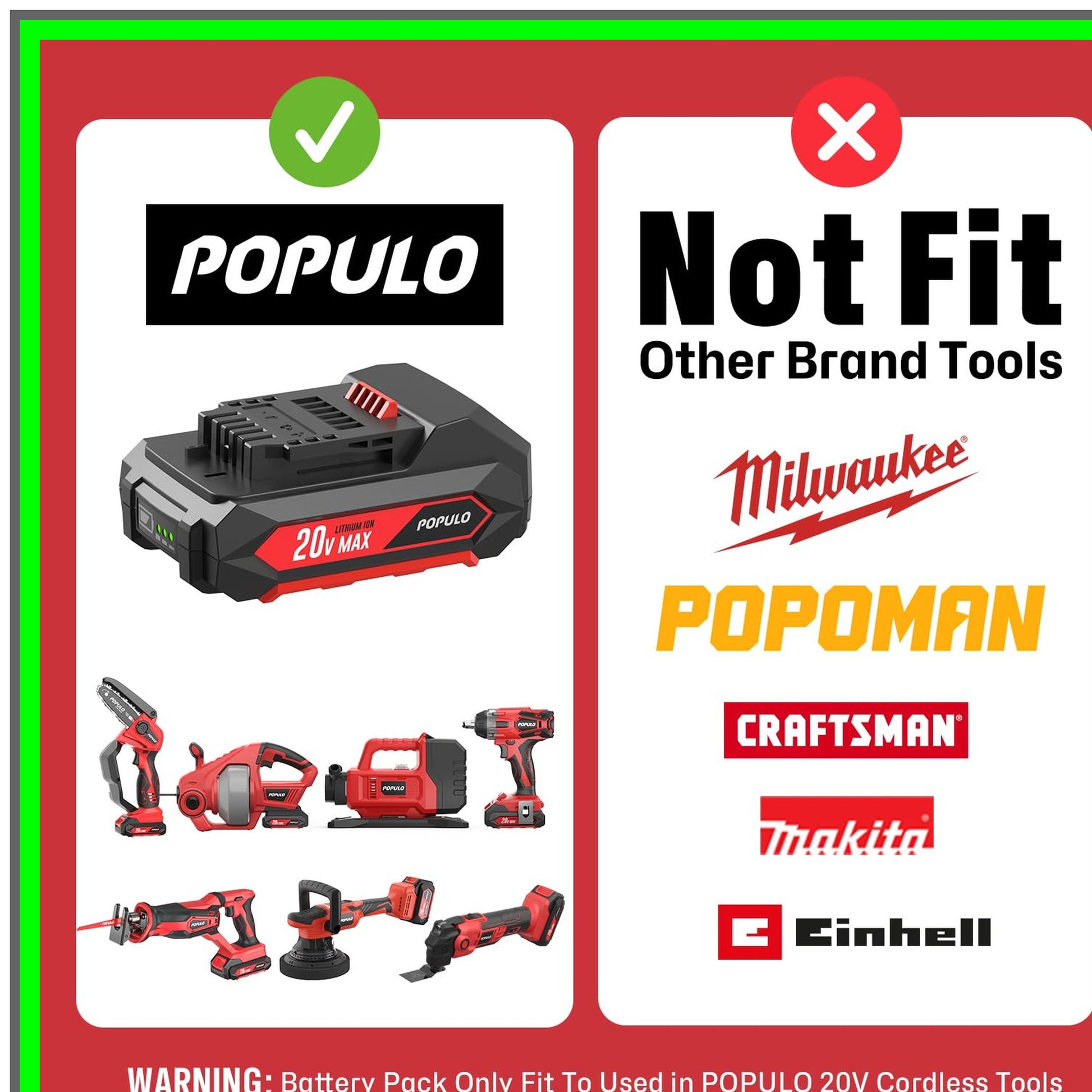 Introducing the ultimate power solution for your cordless tools: the 20V Max Lithium-Ion 2.0Ah Battery Pack. Engineered for efficiency and longevity, this high-performance battery is specifically designed to enhance the functionality of your 20V cordless lithium battery tools. Whether you're tackling home improvement projects, DIY tasks, or professional jobs, this battery pack ensures you have the reliable power you need to get the job done.With its advanced lithium-ion technology, this battery delivers consistent energy output, allowing for longer run times and faster charging. Say goodbye to interruptions and hello to seamless operation. The 2.0Ah capacity strikes the perfect balance between weight and power, making it easy to handle while providing ample energy for even the most demanding tasks.This battery pack is not compatible with Hyper Tough, Bauer, or Popoman tools, ensuring that it is tailored specifically for your 20V cordless tool lineup. Its lightweight design and compact size make it a breeze to transport, while the built-in safety features protect against overheating and overcharging, giving you peace of mind during use.Upgrade your toolkit with this essential battery pack and experience the difference in performance and reliability. Whether you're a seasoned professional or a weekend warrior, this 20V Max Lithium-Ion 2.0Ah Battery Pack is your go-to power source for all your cordless tool needs. Don’t let a dead battery slow you down—invest in the power that keeps you moving forward!