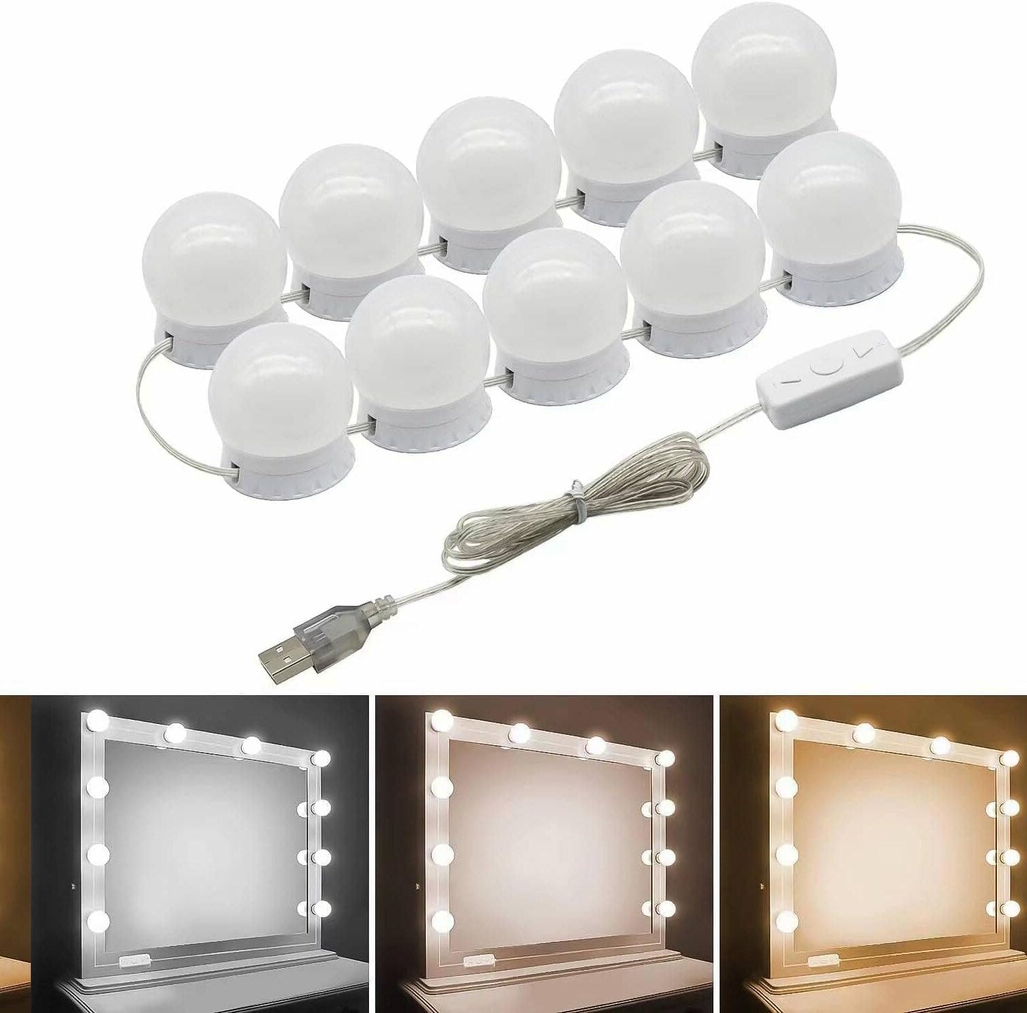 This vanity lighting set features 10 dimmable bulbs with adjustable color temperature and brightness, offering three modes: daylight, natural white, and warm white. The 5-level color temperature adjustment allows customization to suit various needs. An extra-long USB cable provides convenient use, and the safe, standard USB power supply ensures reliable operation. The PC soft bulbs are gentle on the eyes, and the transparent wiring offers a sleek, stylish appearance. Installation is simple: clean the surface, mark the position, adjust wire length, peel off the 3M double-sided tape, stick the bulbs, connect the power, and test. The lights are suitable for use on windowsills, dressing rooms, bathrooms, and vanities without drilling or wall attachment. Each bulb measures 45mm and consumes up to 2W. The product is made from ABS and PC materials, with a total length of 4.64 meters. Easily adjustable via short or long presses on the side buttons, these lights are ideal for makeup, dressing, or decorative purposes.