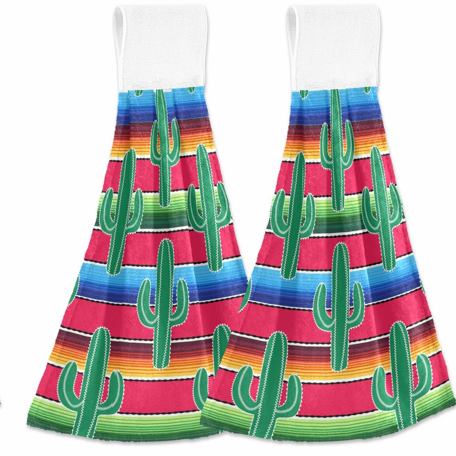 This 2-pack set of hanging hand towels features vibrant patterns, including green cactus, Mexican blanket stripes, and soft cotton textures. Each towel measures 30.5x43.2cm (12x17 inches) and weighs approximately 0.15 pounds. Made from a blend of cotton and polyester, these towels are highly absorbent and easy to clean. Their ultra-soft, lint-free fabric provides a fluffy texture suitable for various uses, such as drying hands, hair, dishes, bottles, or even cleaning floors. Equipped with an adjustable loop, the towels can be conveniently hung anywhere for quick access, making them ideal for use in bathrooms, kitchens, restaurants, hotels, or outdoor settings like barbecues. Lightweight and durable, they are designed for repeated use and long-lasting performance. Please note that manual measurement may result in slight size variations, and color may vary slightly due to monitor differences.