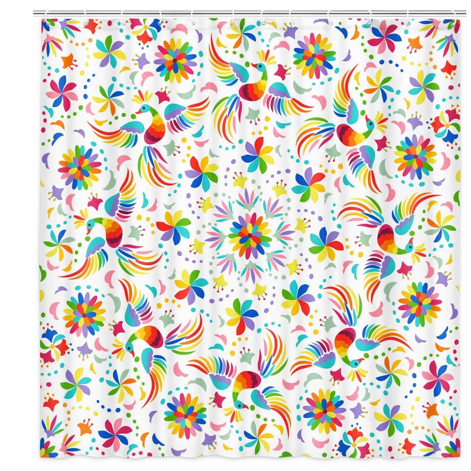 Add vibrant charm to your bathroom with this colorful shower curtain featuring an ornate ethnic pattern inspired by Mexican rainbow designs. Decorated with birds and flowers, it brings a lively and artistic touch to your space. Made from durable polyester, the curtain measures 69 x 70 inches, providing ample coverage. It comes with 12 hooks for easy installation. The curtain is easy to care for—simply machine wash on a gentle cycle with cold water or hand wash as needed. If creases appear, gentle ironing can smooth them out. Please note that slight size variations may occur due to manual measurement, and colors may vary slightly depending on your monitor. This shower curtain is designed to enhance your bathroom’s aesthetic while offering practical functionality, making your daily routine more enjoyable.
