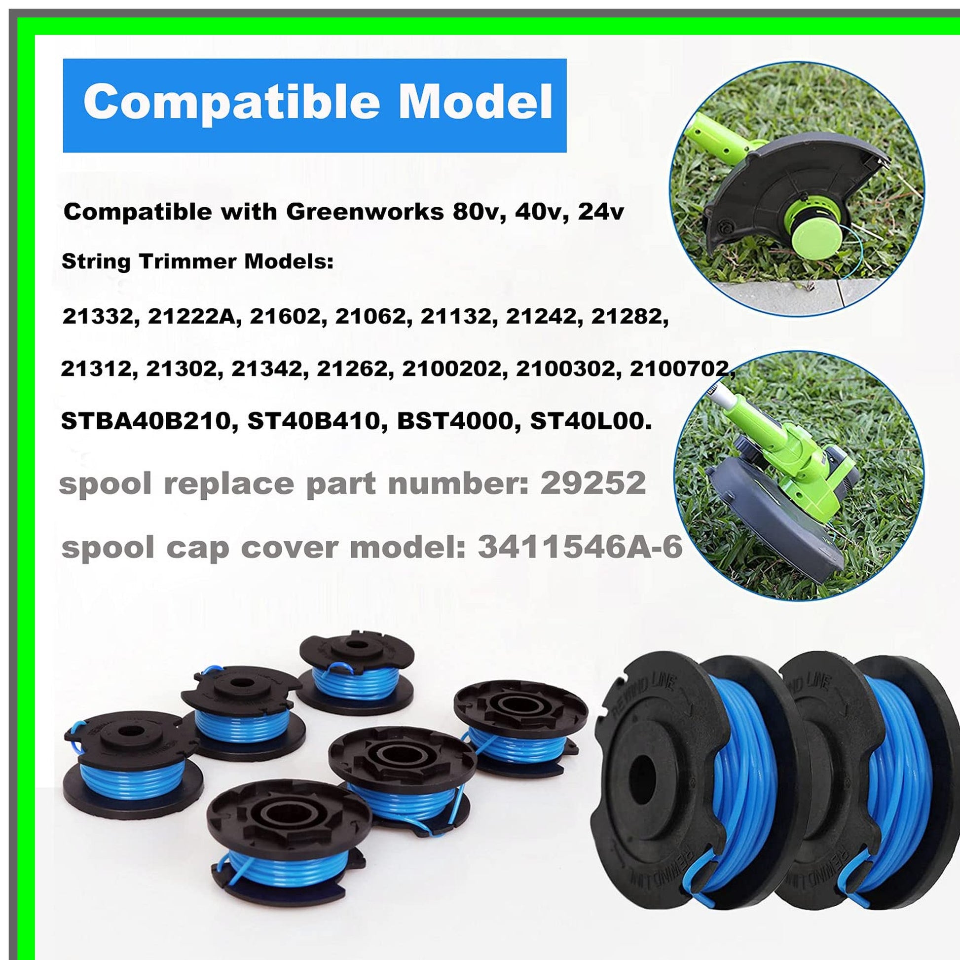 Transform your yard maintenance routine with our premium trimmer spool, designed for seamless compatibility with a wide range of Greenworks string trimmer models. This essential accessory is perfect for those who demand efficiency and performance in their gardening tools. Each spool is expertly crafted to hold approximately 16 feet of durable 0.065-inch diameter trimmer line, ensuring you have the right amount of cutting power to tackle even the toughest weeds and grass.Experience the convenience of automatic winding technology, which allows for quick and hassle-free spool changes. Say goodbye to the frustration of tangled lines and hello to effortless installation. Our tool-less design means you can easily pop the spool in and out of your trimmer, making maintenance a breeze. Whether you're a seasoned gardener or a weekend warrior, you'll appreciate the user-friendly features that make this trimmer spool a must-have for your outdoor toolkit.Included with your purchase is a complimentary cap cover, providing added protection and longevity for your trimmer line. This spool is compatible with all Greenworks single line string trimmers, ensuring versatility and reliability for your lawn care needs. Elevate your trimming experience and achieve a pristine yard with our high-quality trimmer spool, designed to meet the demands of any landscaping project. Invest in your garden's health and beauty today!