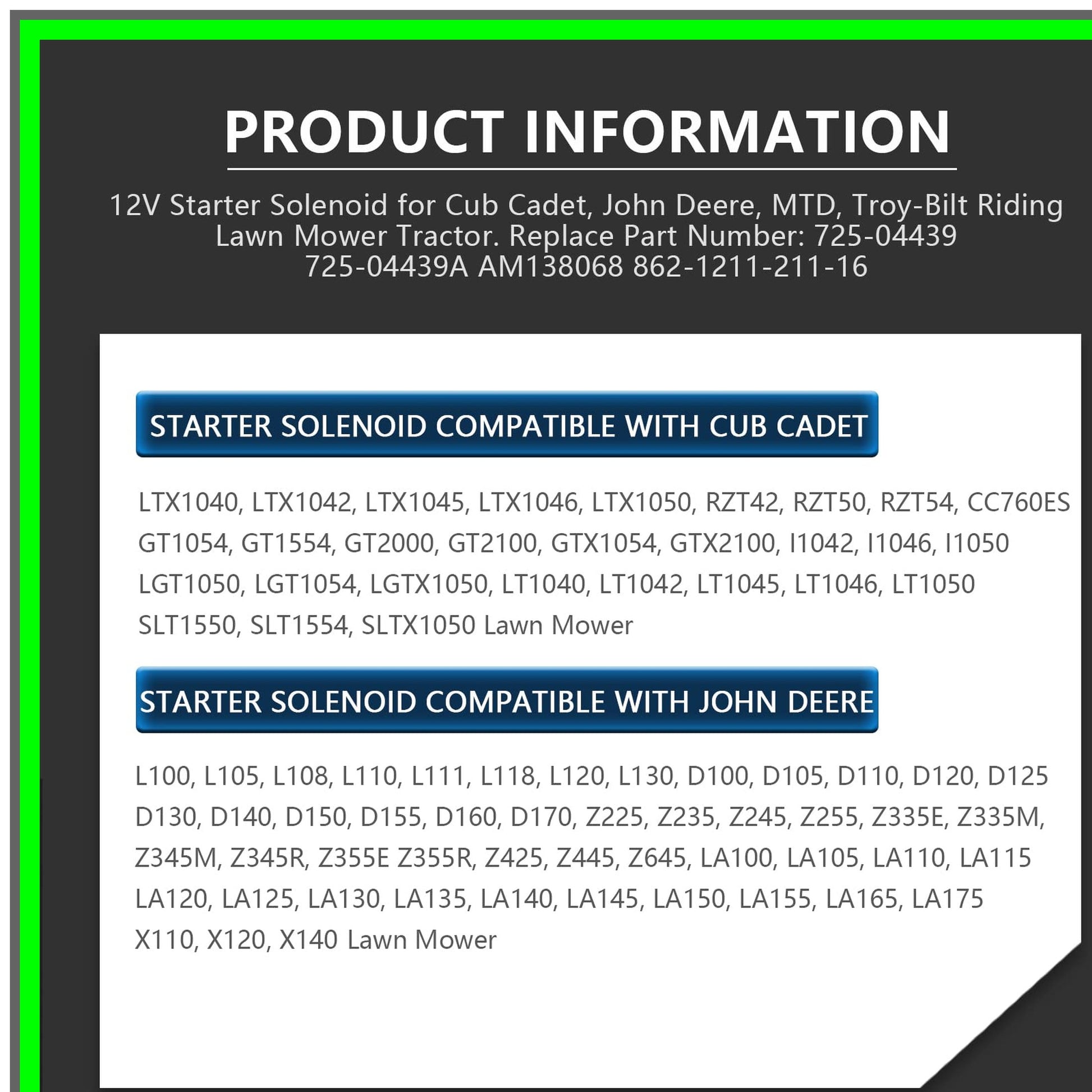 Revitalize your lawn care experience with our high-performance 12V Starter Solenoid, expertly designed for compatibility with popular riding lawn mowers from leading brands like Cub Cadet, MTD, and Troy-Bilt. This essential component ensures reliable ignition and smooth operation, allowing you to tackle your yard work with confidence.Crafted with durability in mind, this solenoid is engineered to withstand the rigors of outdoor use, providing you with a long-lasting solution for your mower's starting system. Its precise design guarantees a perfect fit, making installation a breeze. Simply replace your old or malfunctioning solenoid with this premium part, and enjoy the peace of mind that comes with dependable performance.This starter solenoid is a direct replacement for part numbers AM138068, 725-04439, 725-04439A, and 862-1211-211-16, ensuring compatibility with a wide range of riding lawn mower models. Whether you're a professional landscaper or a weekend warrior, this solenoid will enhance your mower's efficiency, helping you achieve a pristine lawn with minimal effort.Don't let a faulty starter solenoid hold you back. Upgrade to our 12V Starter Solenoid today and experience the difference in your mower's performance. With its robust construction and reliable functionality, this solenoid is the perfect addition to your lawn care toolkit. Get ready to start your mower with ease and tackle any lawn challenge that comes your way!