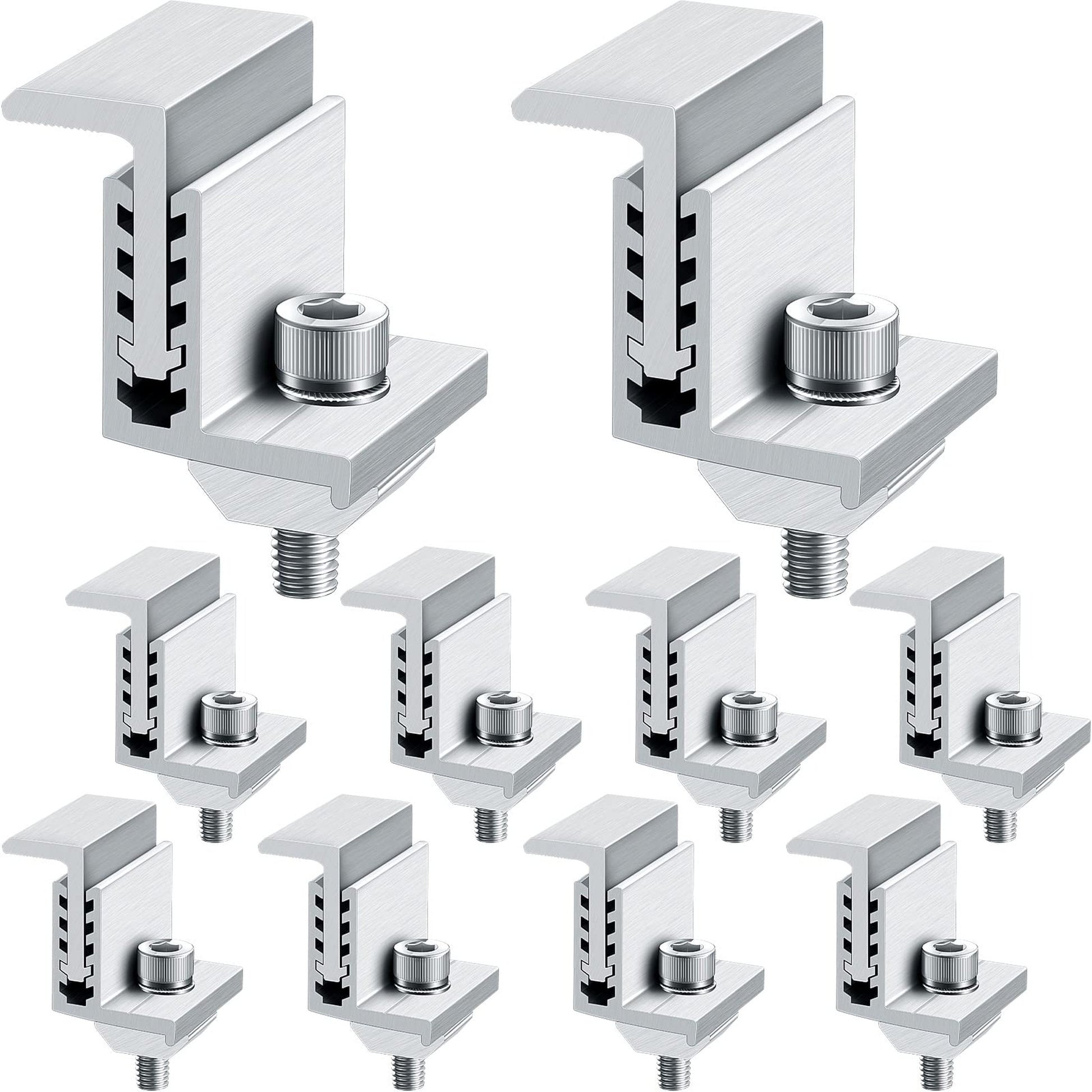 Ideal for both residential and commercial solar projects, these aluminum framed panel clamps are essential for securely fixing your solar panels onto mounting rails. Each package includes 10 adjustable end clamps, providing you with everything you need for a complete installation.