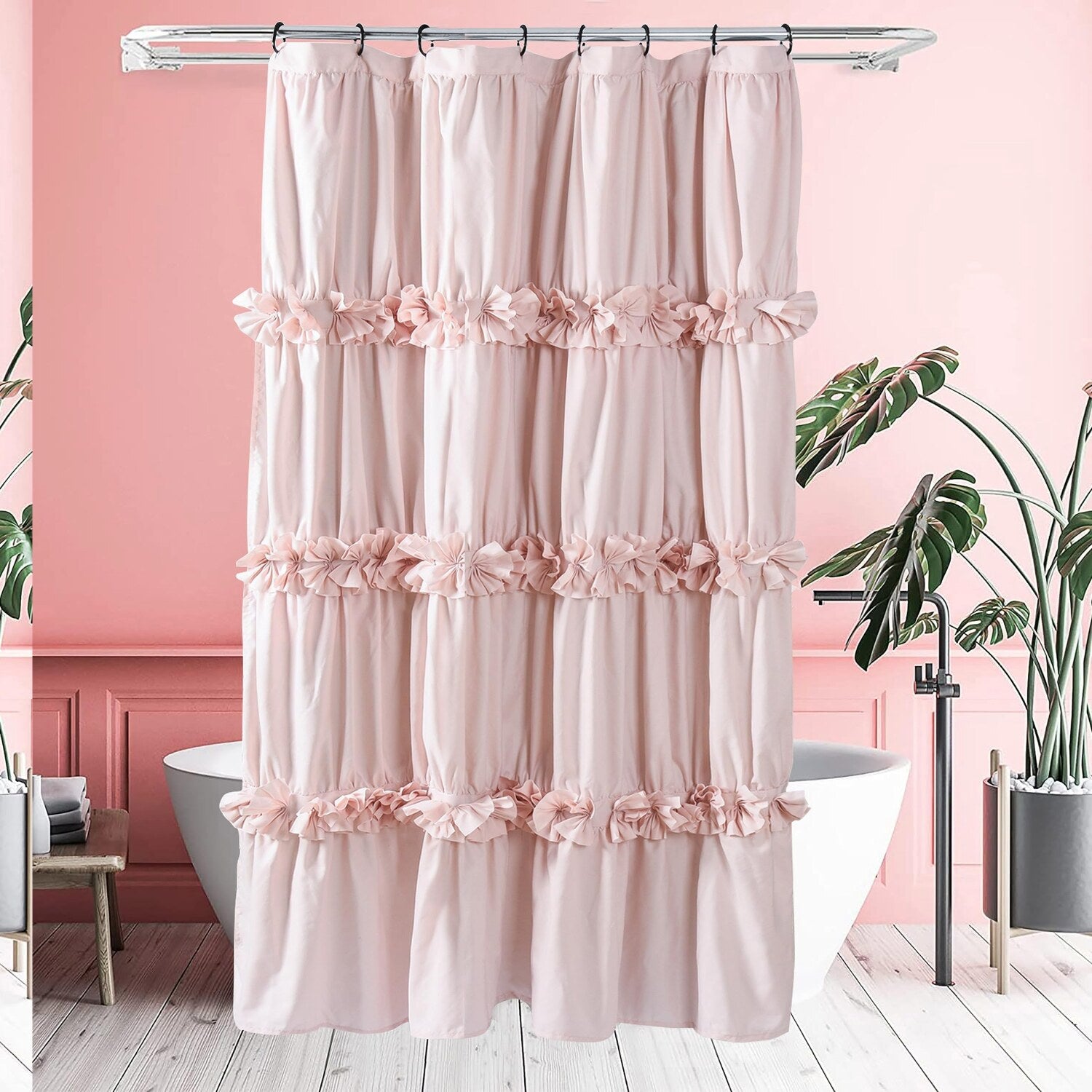 Enhance your bathroom with this Peach Ruffle Shower Curtain, featuring a vintage handcrafted bow tie design and ruched microfiber fabric. The 36" W x 72" H curtain is adorned with delicate frilly ruffles and handcrafted butterfly flowers, adding a feminine touch and textured charm to your space. Equipped with 7 rust-free buttonholes, it allows for easy installation and versatile use as a shower, window, or door curtain, or even as a backdrop. The soft microfiber fabric provides a romantic, spa-like atmosphere, while the elegant ruching and waterfall pattern create a shabby chic aesthetic. Available in a range of colors including Ivory, Gray, Camel, Peach, Cream, Spa Blue, and Black, this curtain is machine washable for easy care. Its thoughtful design makes it a perfect gift for housewarmings or special occasions. Bring a touch of elegance and comfort to your home with this charming, handcrafted curtain.