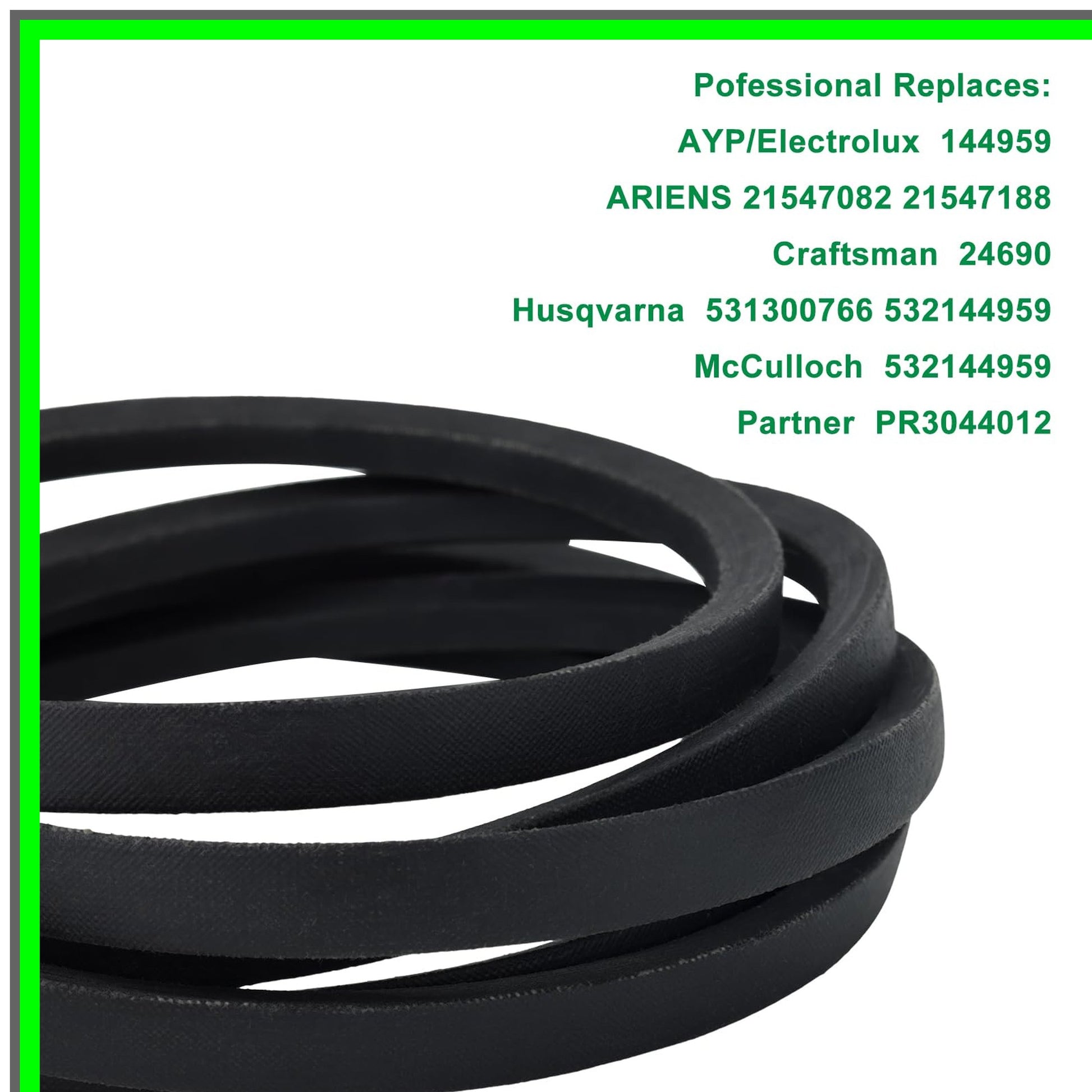 Ensure your engine runs smoothly with our high-quality replacement deck belt, designed for optimal performance and durability. This essential component is compatible with a wide range of models, making it a versatile choice for your repair needs. Before making your purchase, it's crucial to confirm your engine's model and part numbers to avoid any compatibility issues.Our deck belt is specifically engineered to replace various part numbers, including but not limited to Poulan, AYP, Murray, and Toro models. It seamlessly fits the following part numbers: 144959, 532144959, 160855, 130801, 138255, 532130801, 532138255, 532160855, 577203116, 37X61, 37X61MA, M126012, and 88-6240. This 1/2" x 95" belt is built to withstand the rigors of engine operation, ensuring your equipment remains in peak condition.Installation is straightforward, but if you have any doubts about fitment, our customer support team is ready to assist you. We recommend double-checking your specifications to guarantee a perfect match. Included in your purchase is one premium deck belt, crafted for longevity and reliability. Don’t let a worn-out belt slow you down—upgrade today and experience the difference in performance. Whether you're a DIY enthusiast or a professional mechanic, this deck belt is an essential addition to your toolkit. Invest in quality and keep your engine running at its best!