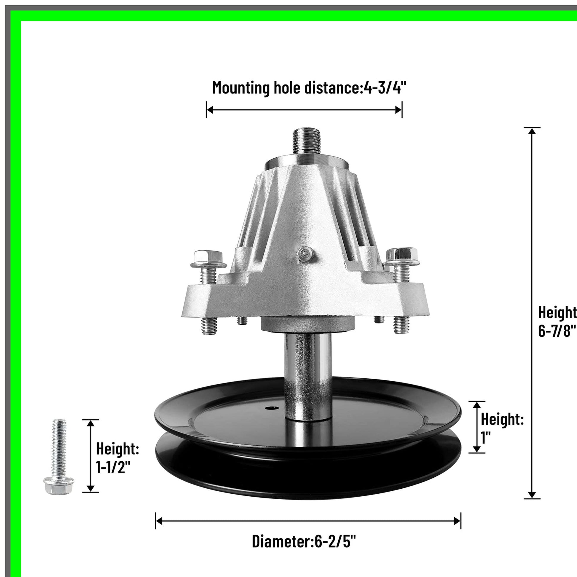Revitalize your lawn care routine with our premium mower deck spindle, expertly designed for a 46" deck lawnmower. This high-performance replacement part is compatible with a wide range of models, including popular brands and series, ensuring a perfect fit for your machine. Whether you own a Cub Cadet XT1 or XT2 series, MTD models, or Troy-Bilt's Super Bronco, this spindle is engineered to enhance your mower's cutting efficiency and overall performance.Crafted with precision, this spindle features a robust construction that withstands the rigors of regular use, providing durability and reliability. The pre-tapped mounting holes and screws simplify installation, allowing you to replace your old spindle without the hassle of additional tapping. With a spindle height of 6-1/4" and a pulley diameter of 6-1/4", it seamlessly integrates into your mower's deck, ensuring optimal blade alignment and cutting power.Replacing your mower deck spindle not only improves the cutting capability but also enhances the performance of your tractor deck and blade, resulting in a cleaner, more professional-looking lawn. Say goodbye to uneven cuts and hello to a beautifully manicured yard. Upgrade your lawnmower today with this essential replacement part and experience the difference in your mowing performance. Perfect for both residential and commercial use, this spindle is a must-have for any lawn care enthusiast looking to maintain a pristine landscape. Don’t let a worn-out spindle hold you back—invest in quality and efficiency for your mowing needs!