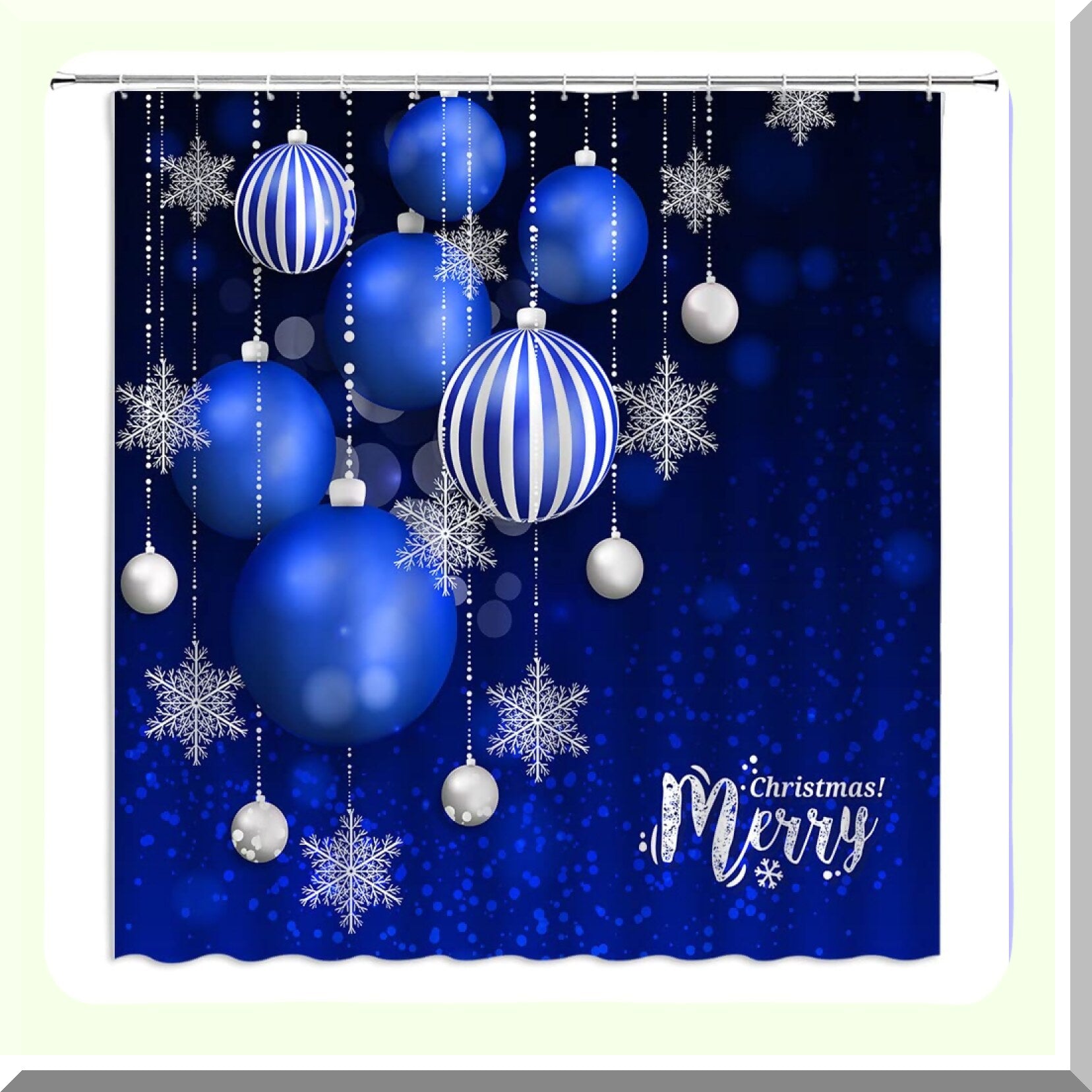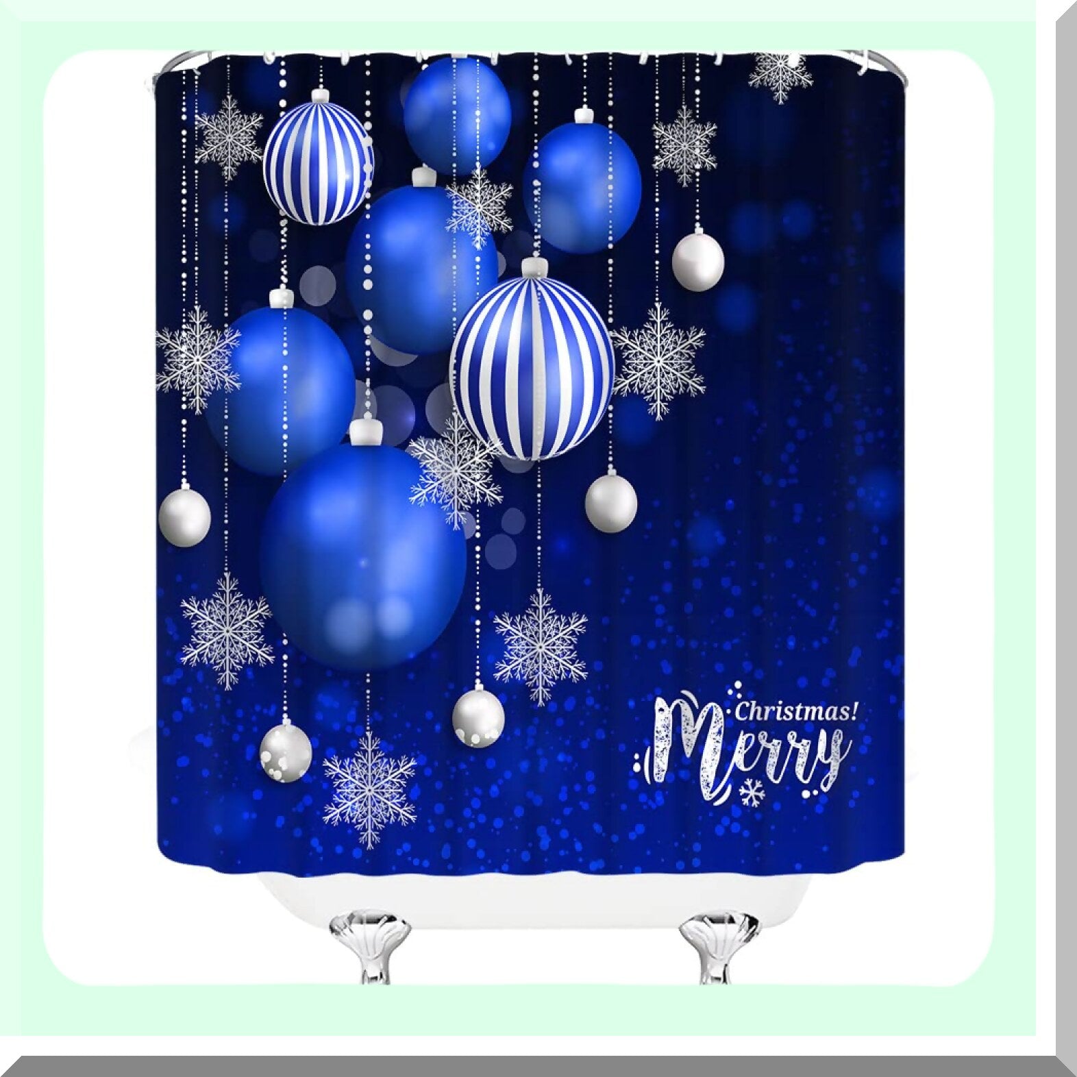 Add a festive touch to your bathroom with this blue and silver holiday-themed shower curtain. Featuring patterns of Xmas balls, snowflakes, and winter motifs, it brings a cheerful atmosphere to your space. Made from durable polyester fabric, the curtain offers long-lasting use and easy maintenance. Its stylish design enhances privacy while adding decorative appeal to your bathroom decor. The curtain is easy to install with included hooks and can fit shower heights between 64 and 96 inches and widths from 36 to 180 inches, making it suitable for various bathtub sizes. The product is printed with 3D digital technology, ensuring vibrant patterns, though slight color variations may occur due to different displays and manual measurement. This shower curtain is a perfect addition for holiday celebrations or winter-themed decor, providing both functionality and seasonal charm.