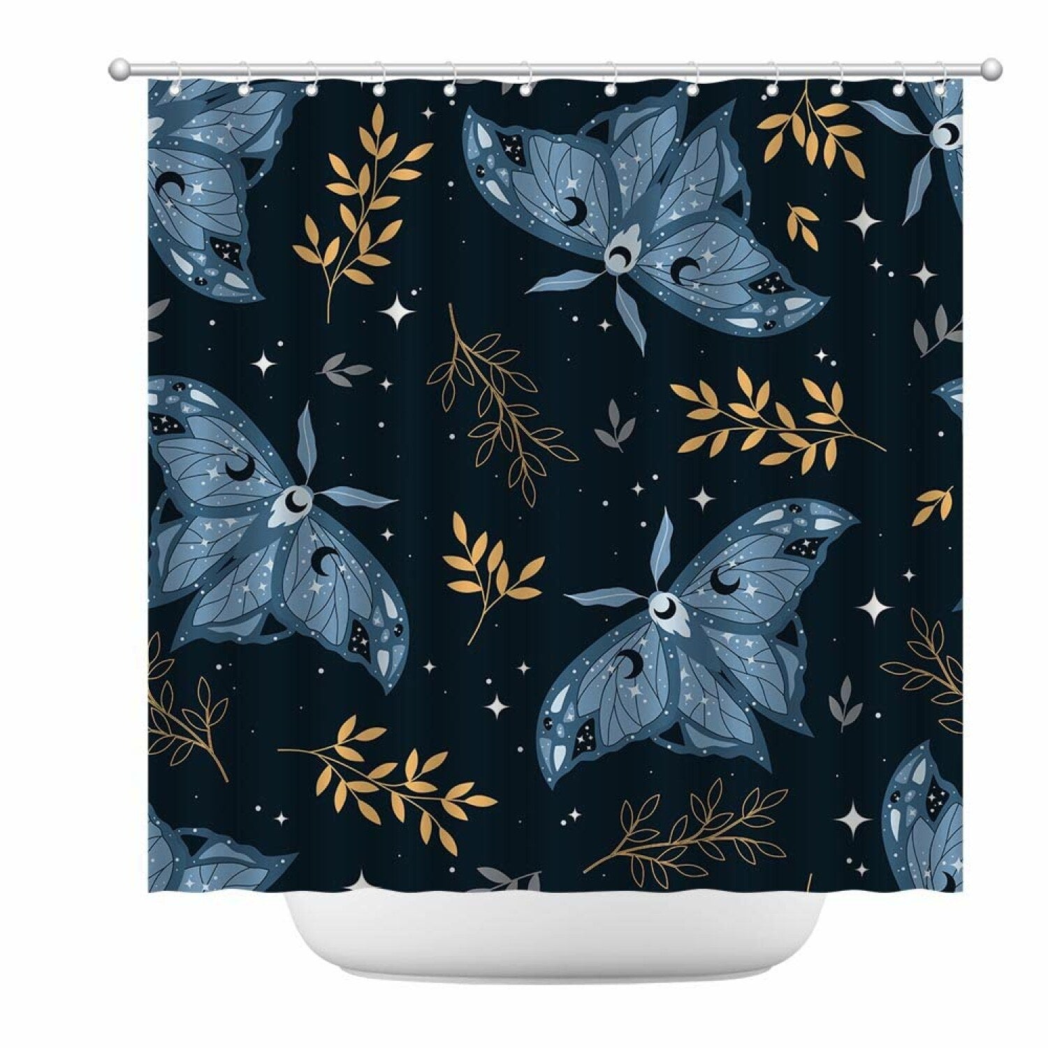 This shower curtain features a unique gothic design with a vintage luna moth pattern, adding a touch of elegance and gothic charm to your bathroom. The clear image and eye-catching pattern create a colorful yet subtle aesthetic, perfect for enhancing your space without overwhelming it. Made from durable, waterproof polyester fabric, it offers long-lasting protection against water damage. Measuring 70.8 inches wide by 70.8 inches high, it fits most standard bathtubs comfortably. The curtain comes with 12 hooks for easy installation, making setup simple and quick. Its dark and mysterious theme provides a stylish statement piece that elevates your bathroom decor. Whether used for practical purposes or as an artistic accent, this shower curtain combines functionality with aesthetic appeal. It also makes a thoughtful gift for anyone looking to upgrade their bathroom decor, adding a blend of relaxation, privacy, and artistic flair to your shower routine.