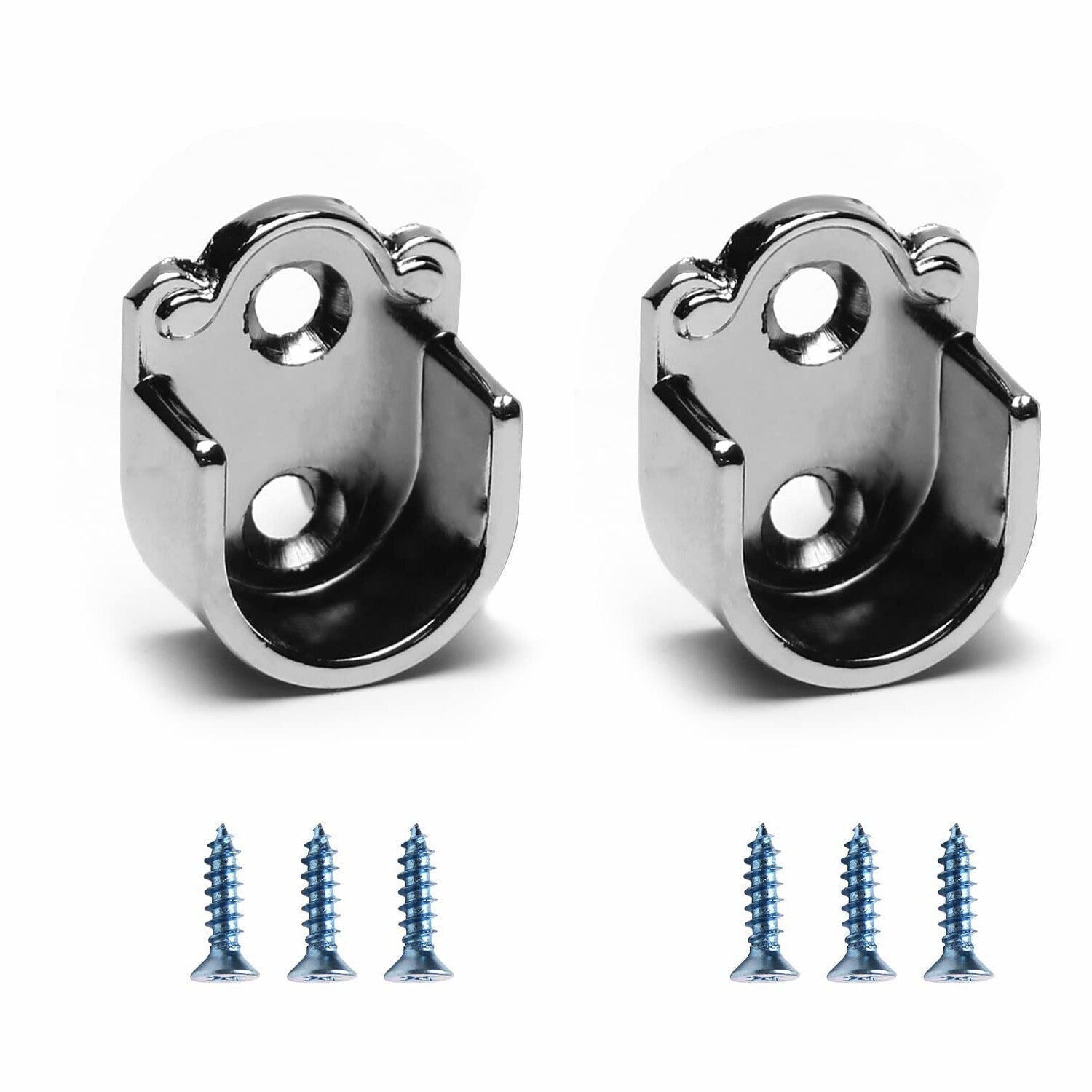 These zinc alloy closet pole sockets are designed with a U-shaped flange to support wardrobe brackets and shower curtain rods. Each socket has a 0.75-inch diameter, suitable for pipes with a 19mm (0.75 inch) diameter. Made from durable zinc alloy with an electroplating finish, they are sturdy enough to hold various hanging objects in home, laundry, or storage areas. The one-piece construction ensures strength and durability, making them ideal for closet rods, shower curtains, or hanging clothes. They can be used to install indoor curtain rods, partition curtains, or clothes poles in different settings such as closets, bathrooms, kitchens, or retail spaces. The package includes two sockets, but screws are not included. These supports are versatile, suitable for supporting rods in homes, hotels, or stores, providing a reliable foundation for hanging items. Please allow slight measurement errors due to manual measurement.