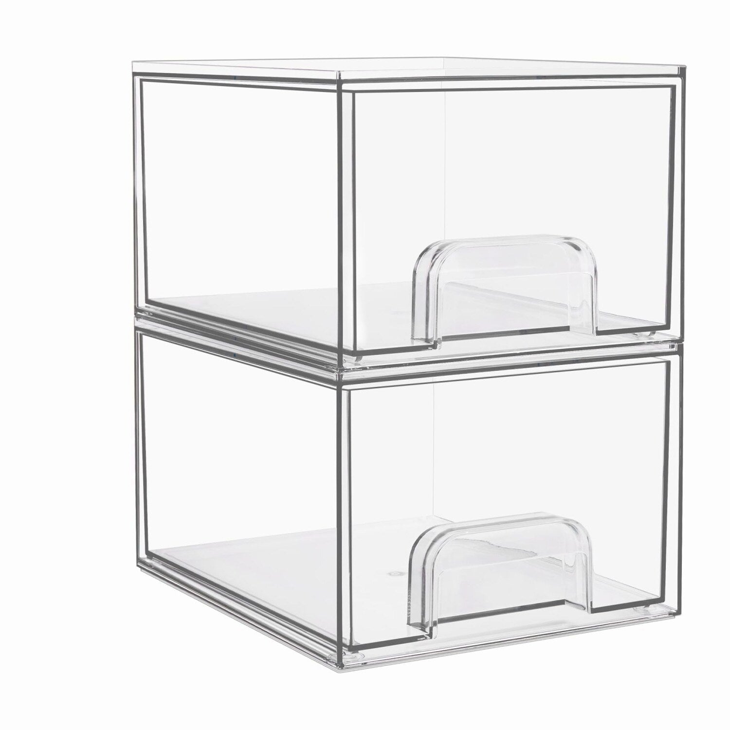 This 2-pack of stackable makeup organizer storage drawers features clear acrylic construction with a height of 4.4 inches. Designed for versatile use, these storage bins are suitable for bathroom countertops, vanities, kitchen or laundry under-sink areas, office desks, medicine cabinets, and pantries. The transparent design allows for easy identification of contents, making organization simple and efficient. Each set includes two durable, stackable drawers that help maximize space and keep your items neatly arranged. Ideal for storing makeup, toiletries, kitchen supplies, or pantry items, these versatile organizers are perfect for maintaining a tidy and accessible environment in various areas of your home. Their compact size and clear material make them a practical solution for decluttering and organizing your space effectively.