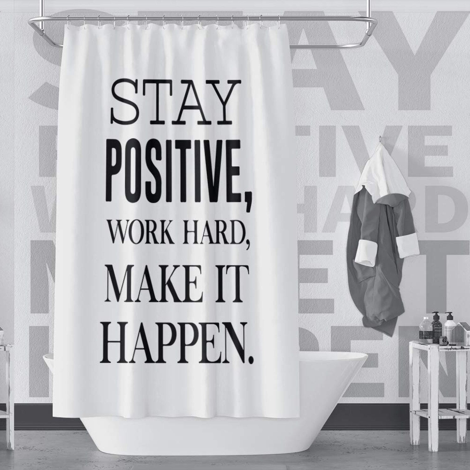 This waterproof polyester shower curtain measures 72x84 inches and features inspiring motivational quotes such as "Stay Positive," "Work Hard," and "Make It Happen." Designed with high-definition 3D printing technology, it displays bright colors and vivid patterns that add vitality to your bathroom decor. The curtain is easy to install—simply fix the hooks on the pole, hang the curtain, and you're ready. Its fashionable design complements various bathroom accessories like towels, carpets, and mats, transforming your space from dull to fabulous. The curtain is suitable for most standard bathtubs and small shower stalls. It is machine washable and dryable, making maintenance simple. Please note slight size variations may occur due to manual measurement, and colors may differ slightly depending on the screen. Enhance your bathroom ambiance with this stylish, motivational shower curtain that combines functionality with inspiring design.