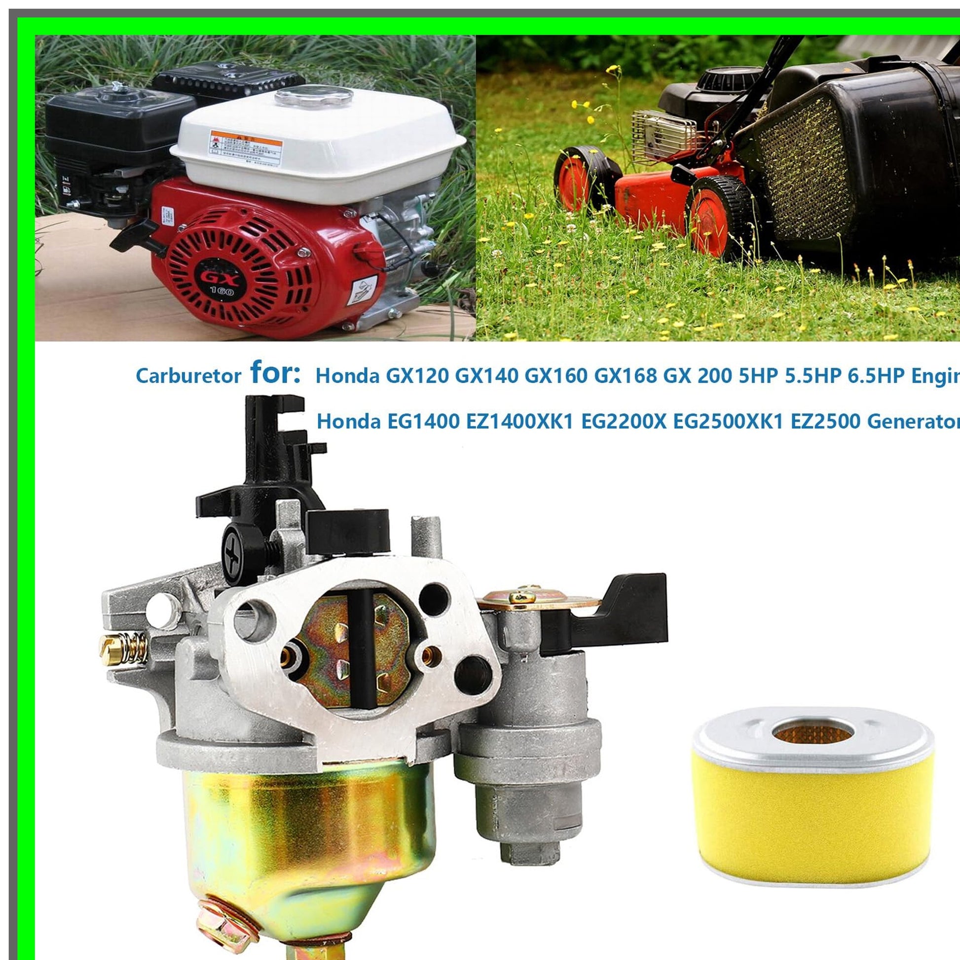Revitalize your small engine performance with our premium aftermarket carburetor kit, designed specifically for Honda models GX120, GX140, GX160, GX168, and GX200, delivering reliable power for 5.5HP to 6.5HP applications. This comprehensive kit includes a high-quality carburetor, an efficient air filter cleaner, and a durable spark plug, ensuring your engine runs smoothly and efficiently.Crafted with precision, this carburetor is a perfect replacement for OEM parts, including 16100-ZH8-W51, 16100-ZH8-W61, 16100-ZE1-814, and 16100-ZE1-825. Our aftermarket solution is engineered to meet or exceed the performance of original components, providing you with an affordable yet effective alternative. Installation is straightforward, making it an ideal choice for both seasoned mechanics and DIY enthusiasts. Before purchasing, we recommend verifying compatibility by checking the provided images and dimensions to ensure a perfect fit for your Honda engine.Experience enhanced fuel efficiency and improved throttle response with this essential upgrade. Whether you're maintaining a lawn mower, generator, or other small engine equipment, our carburetor kit is designed to restore optimal performance and extend the life of your engine. Don’t let subpar components hold you back—invest in our aftermarket carburetor kit today and enjoy the benefits of reliable, high-performance engine operation. Perfect for those who value quality and efficiency, this kit is a must-have for anyone looking to keep their Honda small engine running at its best.