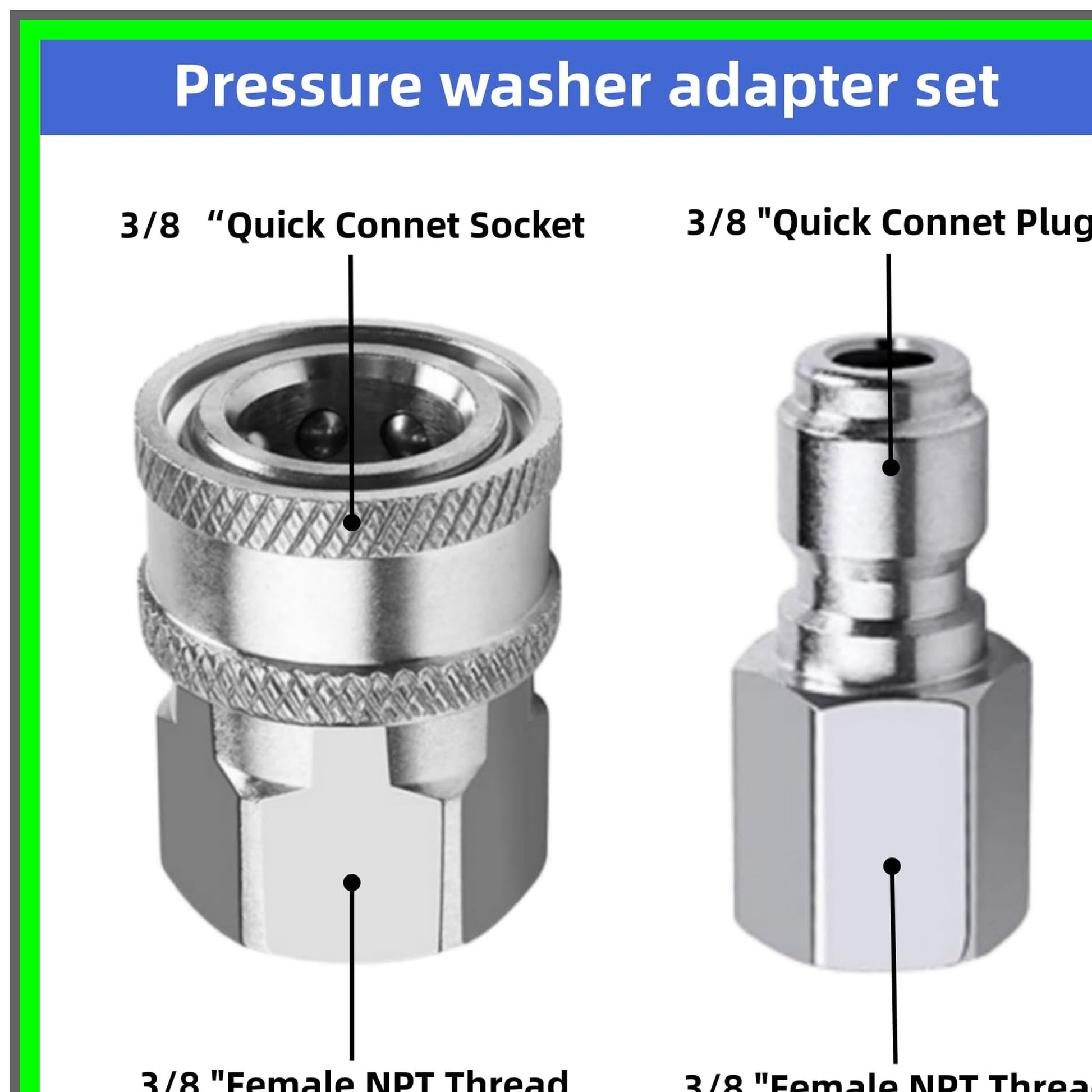 Introducing our innovative pressure washer accessory set, designed to elevate your cleaning experience with unmatched convenience and efficiency. This comprehensive collection features high-quality quick connector plug nipples and adapter sets, making it effortless to assemble and disassemble your pressure washing equipment. Crafted for versatility, these connectors ensure a seamless fit with a variety of attachments, including hoses, water pumps, ball valves, telescoping wands, surface cleaners, and spray guns. Say goodbye to the hassle of complicated setups; our user-friendly design allows for quick connections, enabling you to switch between tasks in seconds. Constructed from durable materials, these pressure washer connectors are built to withstand the rigors of outdoor cleaning, ensuring long-lasting performance. The secure fit minimizes leaks and maximizes water flow, providing you with the power needed to tackle even the toughest grime and dirt. Whether you're a professional cleaner or a DIY enthusiast, this accessory set is essential for optimizing your pressure washing system. Experience the difference in efficiency and effectiveness as you effortlessly transition between different cleaning tools. Upgrade your pressure washing game today with our reliable and easy-to-use connector set. Perfect for residential and commercial use, this product is your go-to solution for achieving sparkling clean surfaces with minimal effort. Don’t let cumbersome connections slow you down—invest in our pressure washer accessory set and enjoy a streamlined cleaning process that saves you time and energy.