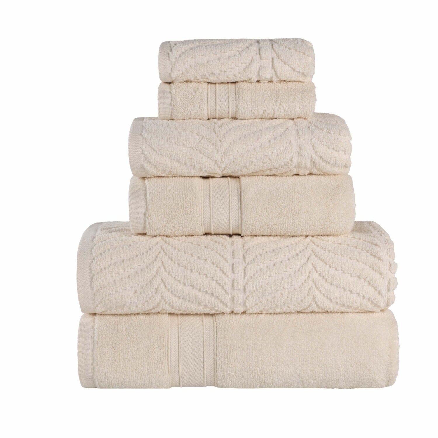 Enhance your bathroom with this 6-piece towel set crafted from soft, strong cotton fibers. The zero twist design features smooth loops that feel plush against the skin, providing a luxurious and quick-drying experience. This set includes two face towels (13" x 13"), two hand towels (30" x 16"), and two bath towels (54" x 30"), all designed to offer maximum comfort and absorbency. The towels showcase a combination of solid and jacquard chevron patterns, adding a touch of elegance to any decor style. Available in a variety of colors including white, ivory, platinum, black, and gold, they are suitable for master baths, guest bathrooms, spas, or resorts. Each towel features a hanging loop for easy storage. For optimal softness and longevity, wash with like colors, tumble dry low, and remove promptly from the dryer.