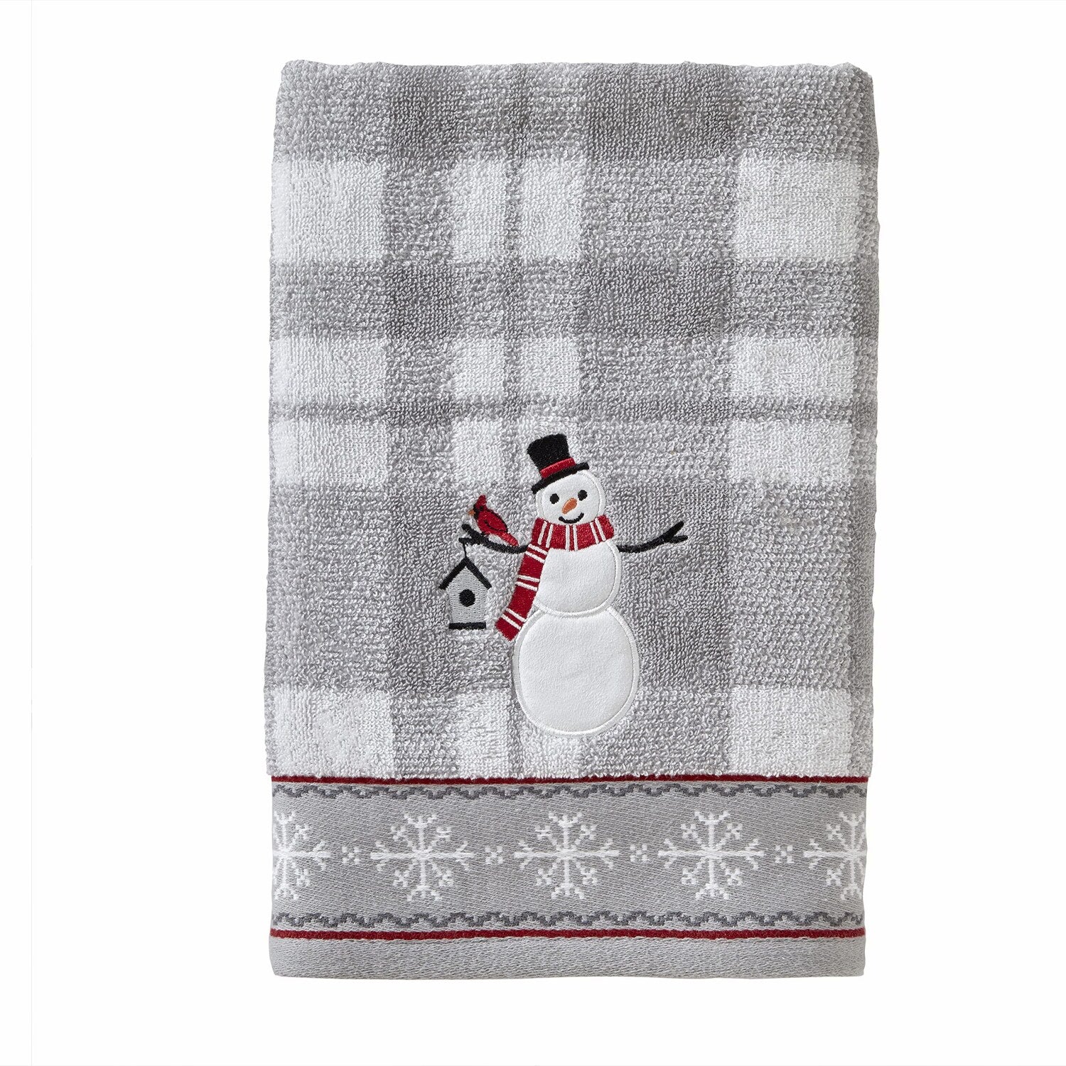 Bring a touch of winter charm to your bathroom with this plush gray bath towel. Crafted from 100% cotton, it measures 24" x 48" and features a cozy plaid terry design complemented by a snowflake jacquard border along the hem. Embroidered snowmen add a playful, festive element, while double-stitched side seams enhance durability. This towel offers a blend of personality and comfort, perfect for adding a cheerful touch to your space. Pair it with coordinating hand towels and accessories, sold separately, to complete the look. Designed to suit various decor styles, from modern to cozy, it brings personality, fun, and flair to your bathroom. With over 40 years of experience and a focus on premium fabrics and global inspiration, this towel combines quality and style for everyday use.