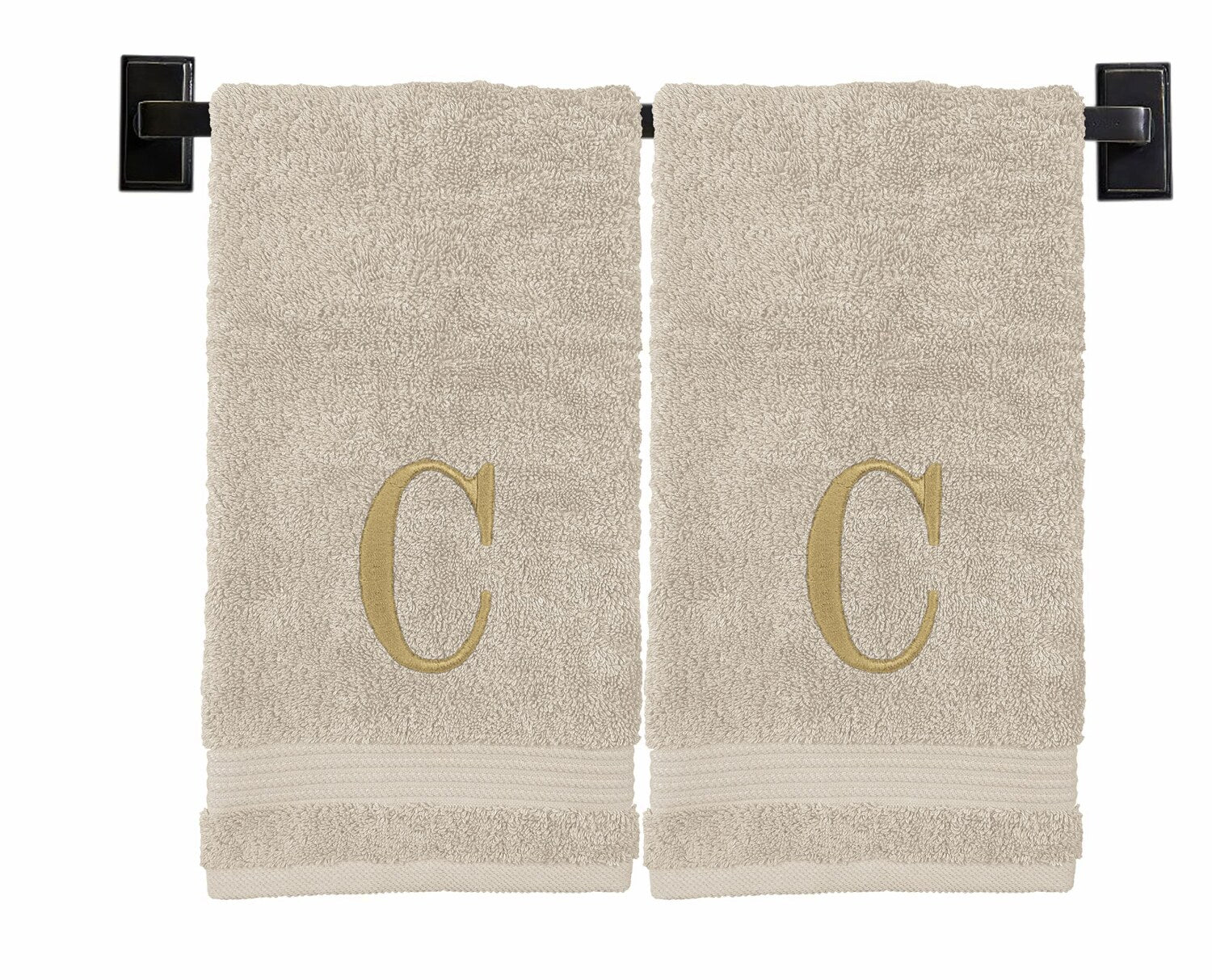 This set of two monogrammed hand towels is crafted from 100% Turkish cotton, offering exceptional softness and high water absorption. Each towel measures 16 x 27 inches and features a beautiful dobby design with reinforced seams and double stitching for durability. The towels are prewashed with no pesticides or processing, ensuring a natural feel. Personalize your towels with any letter, choosing from a variety of thread and towel colors, including black, white, beige, gold, gray, and navy blue. Each towel is embroidered at a Wisconsin-based studio, providing a polished, personalized touch. The towels are OEKO-TEX and ISO 9001 certified, reflecting quality and safety standards. Care is simple: machine wash with like colors, tumble dry low, and remove promptly. These decorative towels combine elegance and functionality, making them a stylish addition to any bathroom. Trust in their quality, backed by positive reviews and careful craftsmanship.