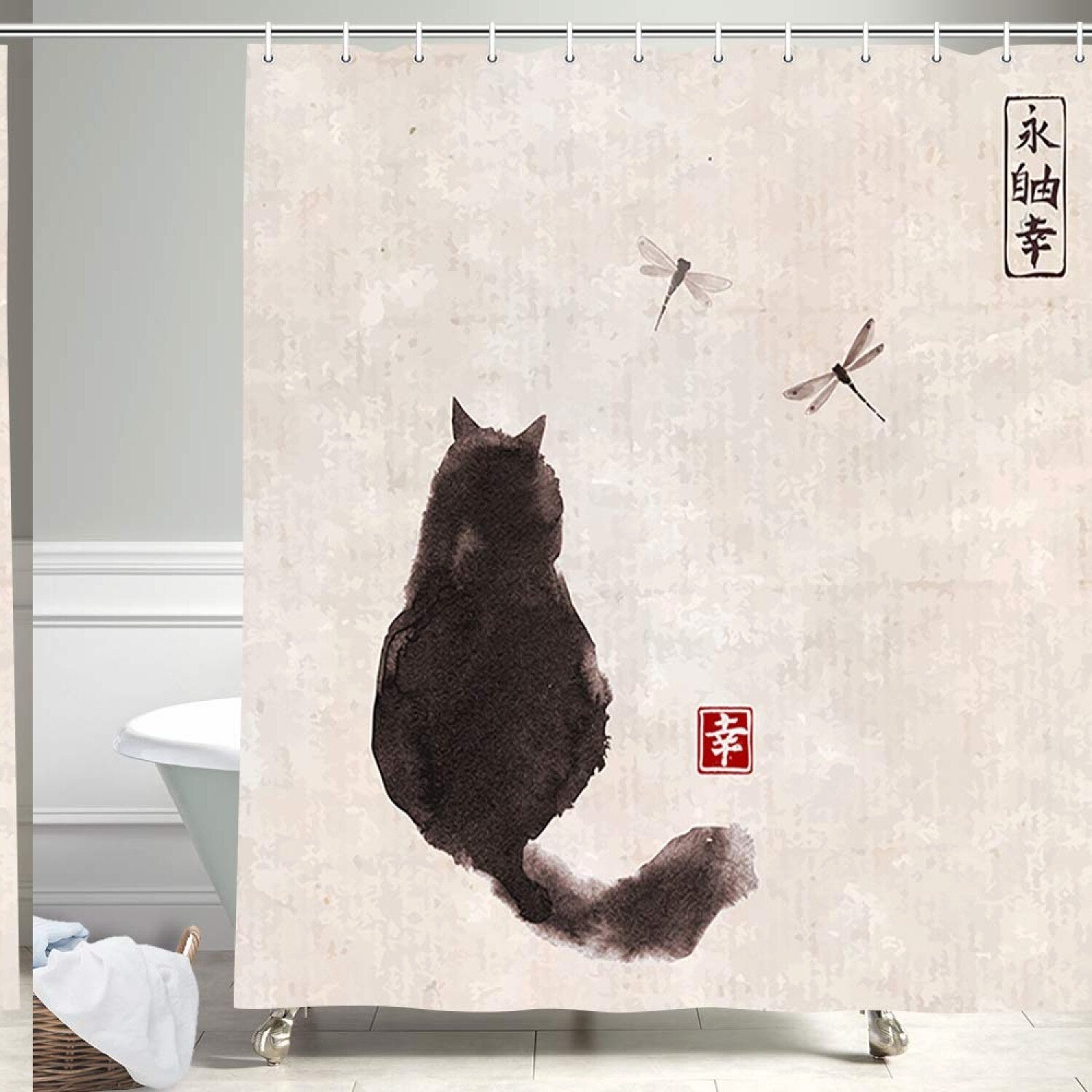This traditional ink painting shower curtain measures 70x70 inches, suitable for bathroom use as well as bedroom or home decor. Crafted from waterproof polyester fabric, it is quick-drying and resistant to fading. The design features a black fluffy cat watching over dragonflies, set against a vintage fabric background, with a variety of pattern options including animals, abstract, floral, and more. Customization of size and pattern is available to meet your preferences. The package includes one shower curtain and twelve plastic hooks for easy installation. It can be washed by hand or machine for convenient maintenance. Please note that colors may vary slightly from digital images due to monitor differences. If you have specific requirements or preferences, feel free to contact us for customization options.