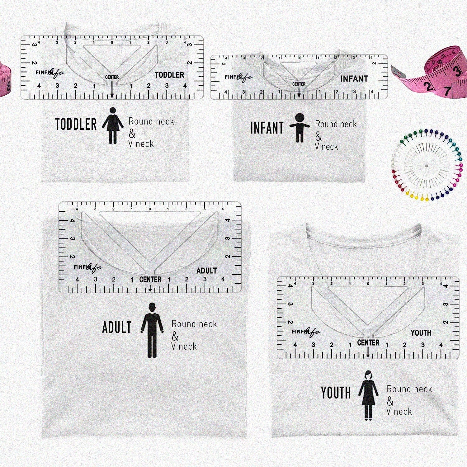 The PerfectFit Tee Ruler Set includes six guides designed to assist with aligning designs on T-shirts of various sizes, from infant to adult. Made of durable PVC, each ruler features engraved sizing charts that won’t fade or peel over time. The set offers precise measurement for both front and back placements, ensuring consistent alignment for graphic designs, whether hand-drawn or applied via heat transfer, sublimation, screen printing, or vinyl pressing. The rulers are portable and easy to store, with options in two colors—parent and white—to cover all neck areas for accurate measurement. Included are four different sizes—infant, toddler, youth, and adult—and a measuring tape along with 40 pear pins for secure placement. These tools simplify the process of aligning transfers, taking the guesswork out of design placement and helping achieve professional results every time.