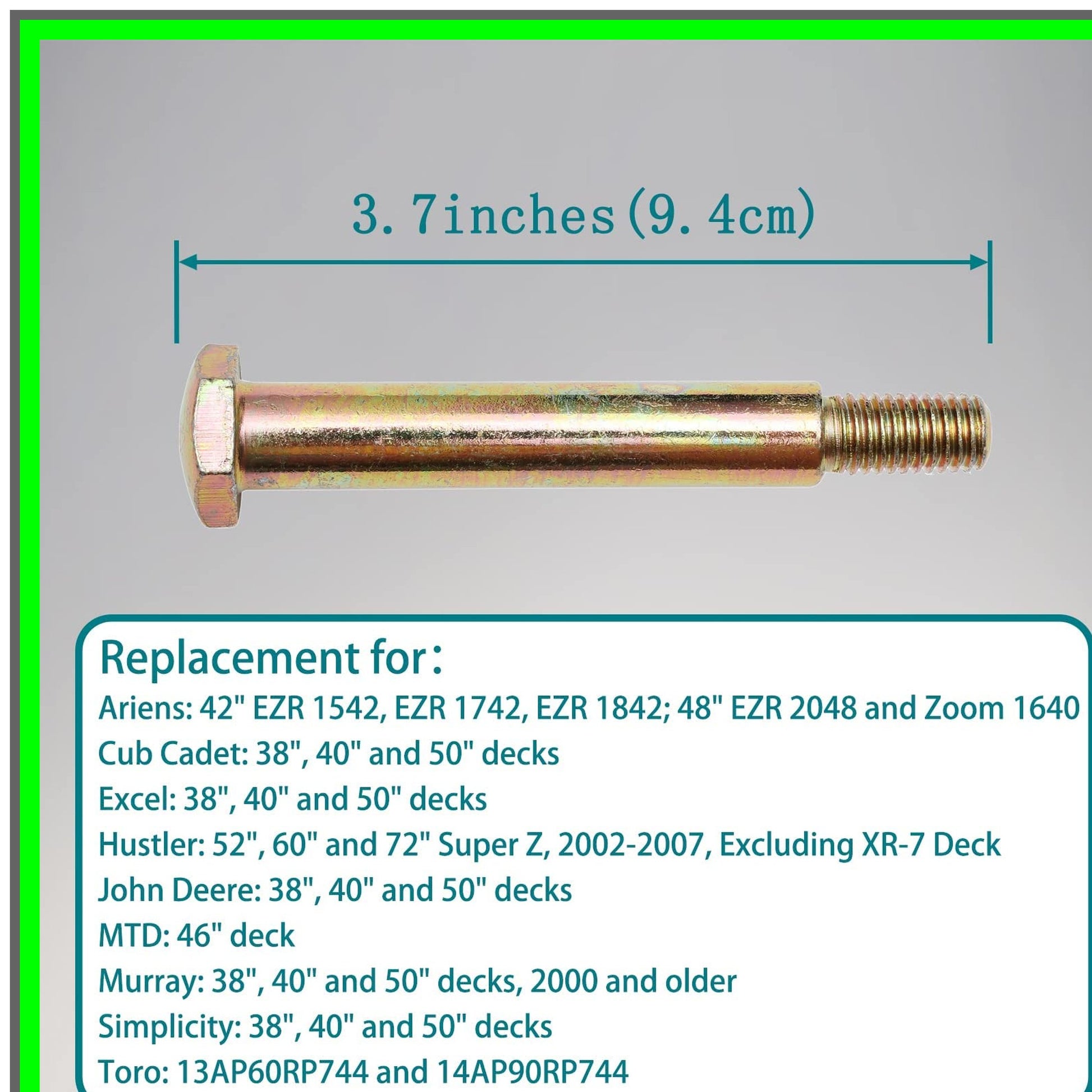 Introducing our premium wheel bolts, engineered for exceptional durability and performance. These high-quality components are designed to replace a wide range of OEM parts, ensuring a perfect fit for your lawn care equipment. Crafted from robust materials, our wheel bolts promise long-lasting reliability, making them an essential addition to your maintenance toolkit.Compatible with various brands, including Ariens, Cub Cadet, Husqvarna, and more, these wheel bolts are the ideal solution for those seeking to enhance their mower's performance. They replace numerous part numbers, such as AYP/Roper/Sears 137644, 182419, and 184218, as well as Cub Cadet 738-3056 and Husqvarna 532-137644, among others. This extensive compatibility ensures that you can easily find the right fit for your specific model.Whether you're maintaining a 42" EZR 1542 or a 60" Super Z, our wheel bolts are designed to withstand the rigors of outdoor use. They are perfect for various deck sizes, including 38", 40", and 50" decks from brands like MTD, Murray, and Toro. With our wheel bolts, you can trust that your equipment will operate smoothly and efficiently, allowing you to tackle any lawn care task with confidence.Installation is straightforward, making it easy for both professionals and DIY enthusiasts to upgrade their equipment. Don't compromise on quality; choose our wheel bolts for a reliable, high-performance solution that keeps your lawn mower running at its best. Elevate your lawn care experience today with our precision-engineered wheel bolts, designed to meet the demands of both residential and commercial users.
