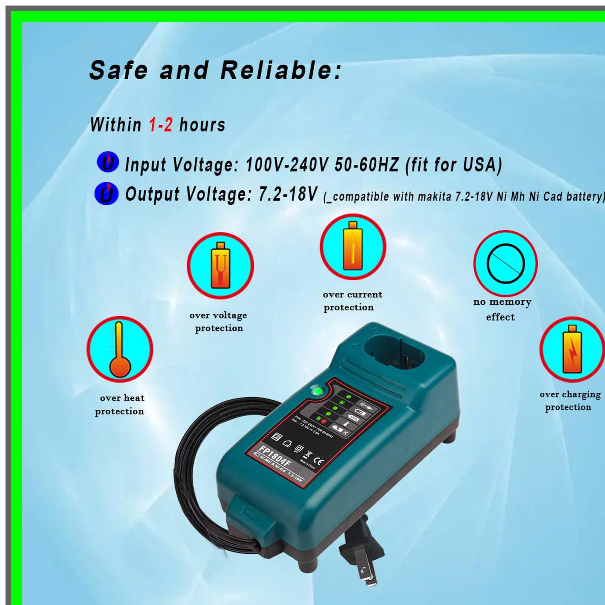 Introducing the ultimate solution for your cordless power tool needs: the versatile FP1804F Battery Charger. Engineered with precision and crafted from premium materials, this charger is designed to meet the highest safety standards, ensuring reliable performance for all your battery charging requirements. With a wide input voltage range of 100V-240V and compatibility with both 50Hz and 60Hz, the FP1804F is perfect for use in the USA and beyond. It supports output voltages from 7.2V to 18V, making it an ideal choice for a variety of lithium-ion batteries, including stick and pod styles. This charger is universally compatible with popular brands, including Makita's extensive range of nickel cadmium and nickel metal hydride battery packs.The FP1804F is not just about compatibility; it’s packed with advanced safety features. The charger is equipped with indicator lights that provide real-time feedback on the charging status, ensuring you’re always informed. It includes unique protections such as automatic shut-off for defective batteries, short-circuit prevention, and overheat detection, giving you peace of mind while charging.For optimal performance and longevity, proper storage is essential. Keep the charger away from heat sources and metal objects, and avoid leaving batteries on the charger during storage. Ensure it’s stored in a dry place, away from direct sunlight, and out of reach of children.Elevate your power tool experience with the FP1804F Battery Charger—your reliable partner for efficient and safe charging. Whether you’re a DIY enthusiast or a professional tradesperson, this charger is designed to keep your tools powered and ready for action. Don’t settle for less; choose the FP1804F for unmatched quality and performance.